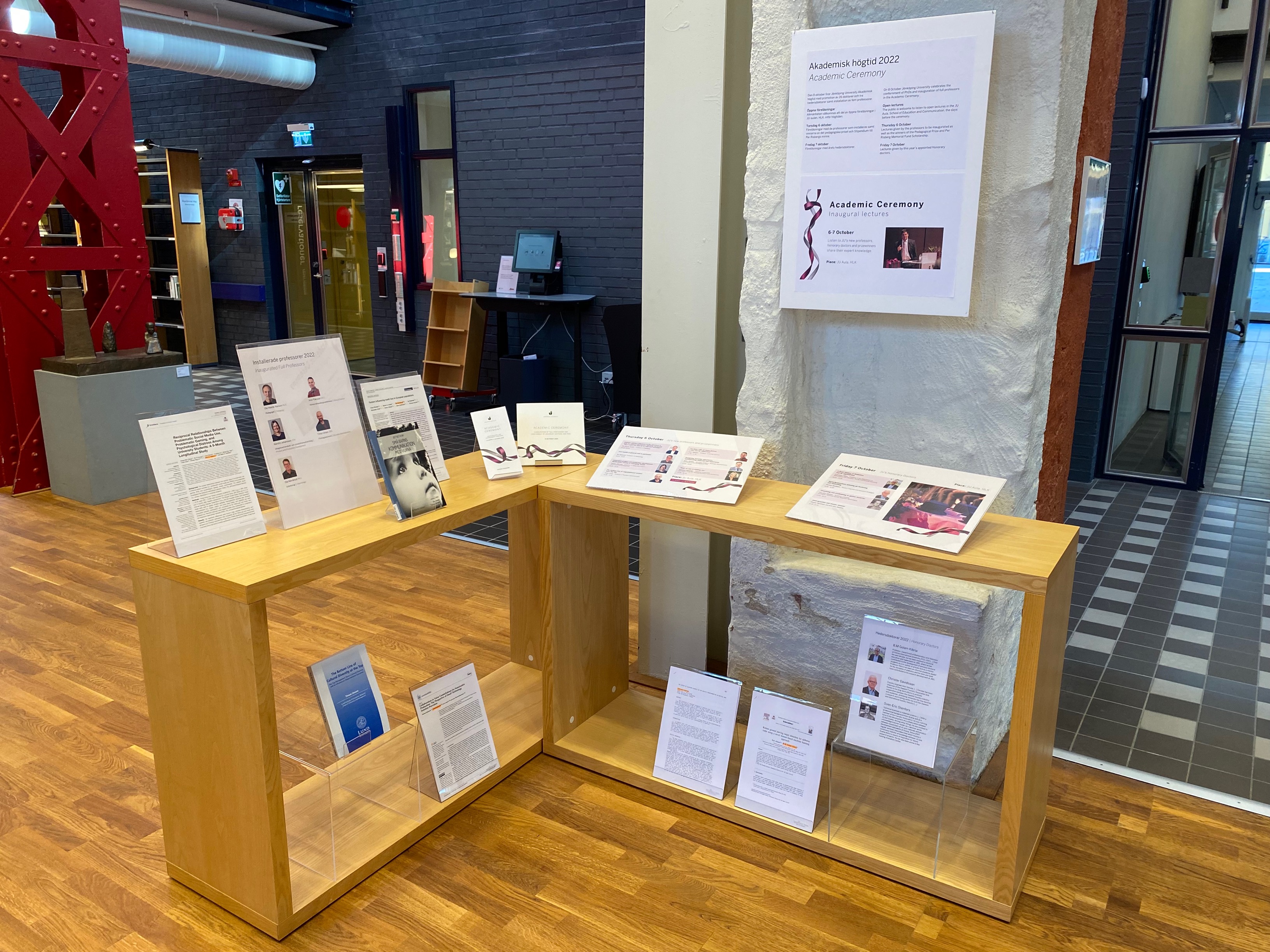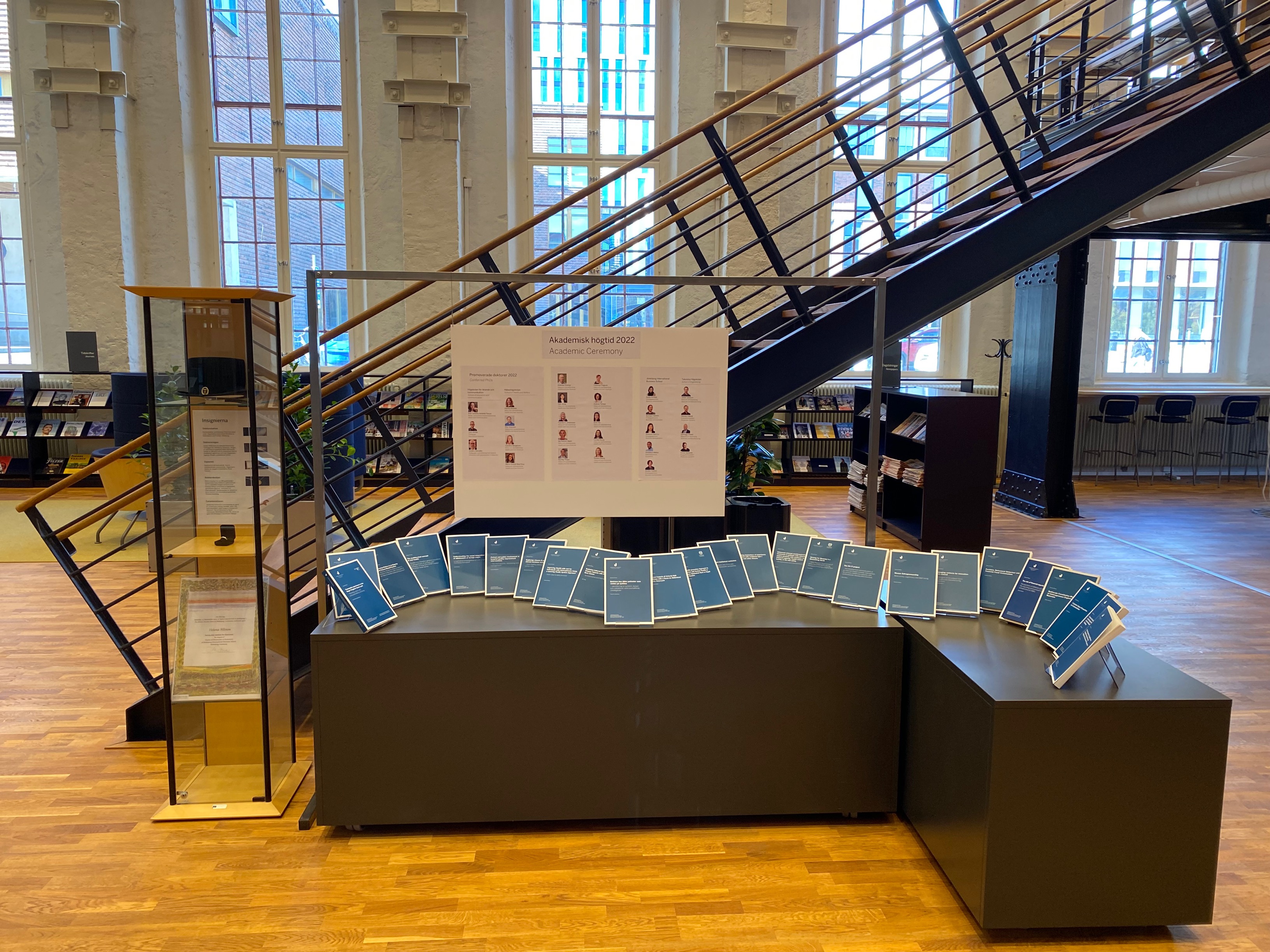 Lördagen den 8 oktober firar JU Akademisk högtid med professorsinstallation och doktorspromotion. På biblioteket uppmärksammar vi detta med en utställning, där du kan ta del av avhandlingar och andra publikationer från de deltagande doktorerna och professorerna.