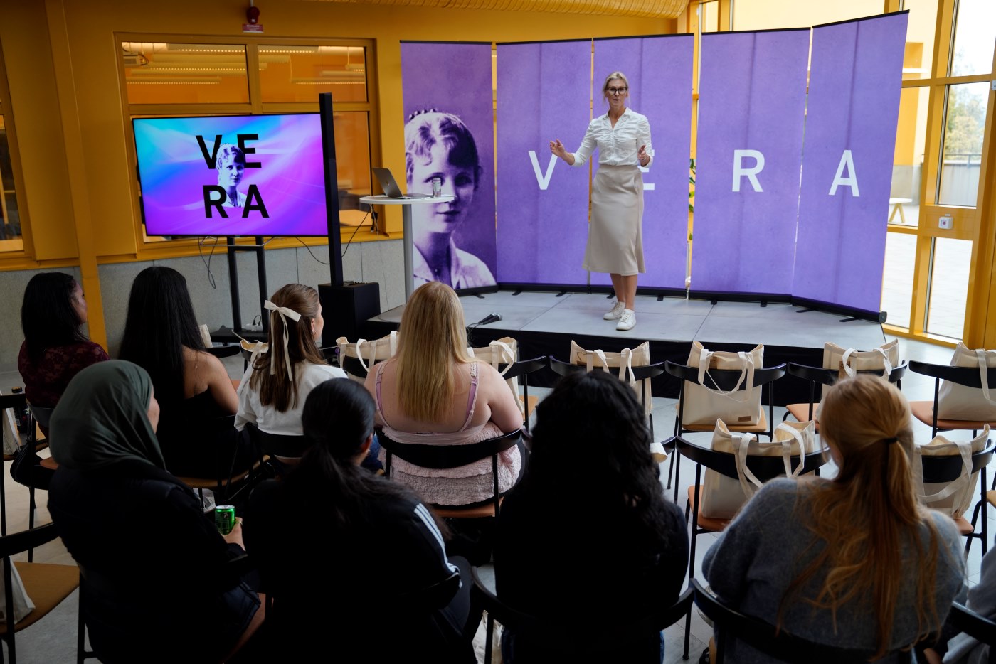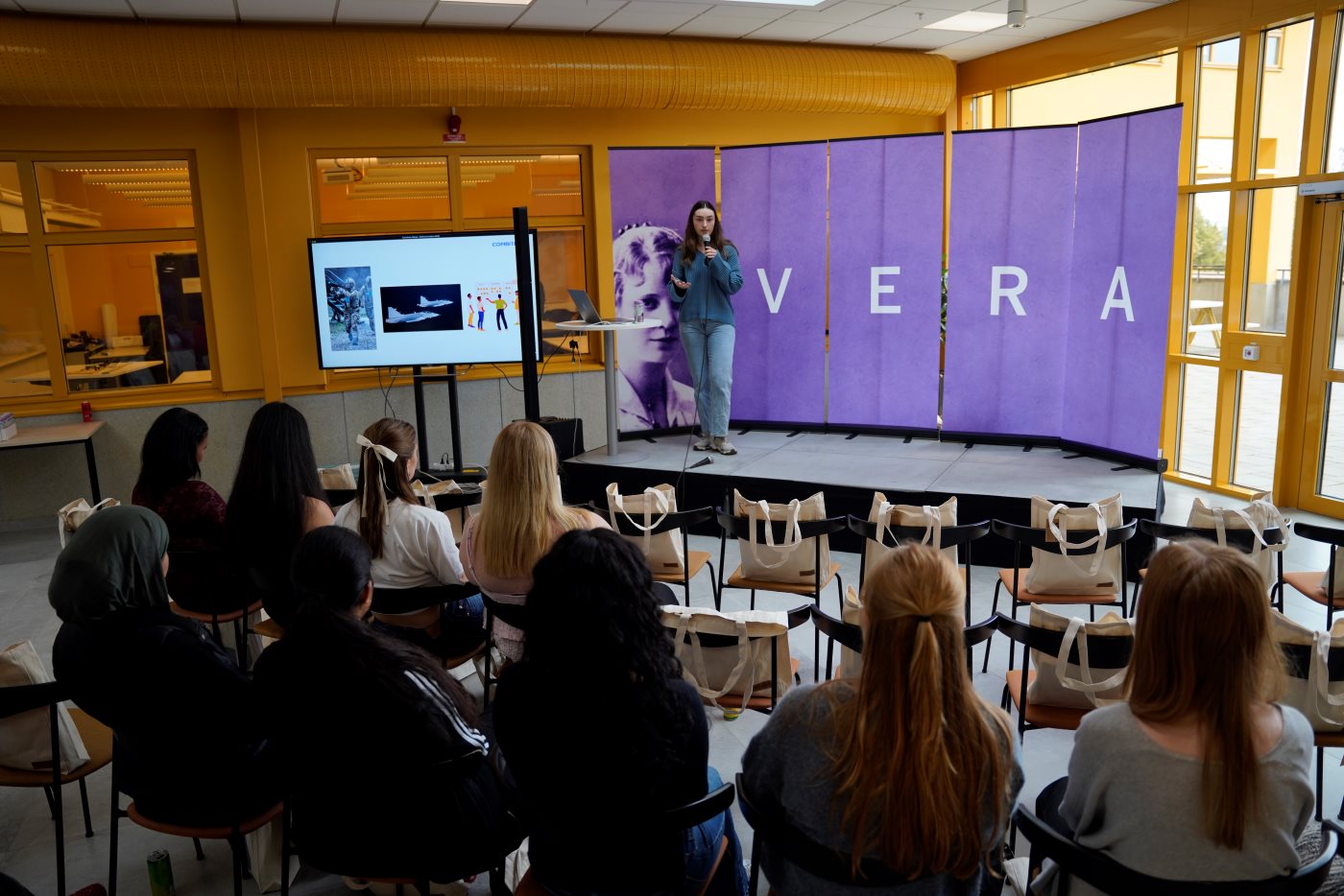 Under VERA-dagen bjöds gymnasietjejerna på lunch och fick lyssna på kvinnor som jobbar inom teknikbranschen och som alla har studerat till ingenjör på JTH. Medverkade gjorde även två representanter från JU Solar Team, som pratade om hur de bygger och nästa år ska tävla med en solbil i Bridgestone World Solar Challenge i Australien. Talarna delade även med sig av sina erfarenheter i en paneldiskussion där de berättade mer om hur det är att verka i en mansdominerad bransch.