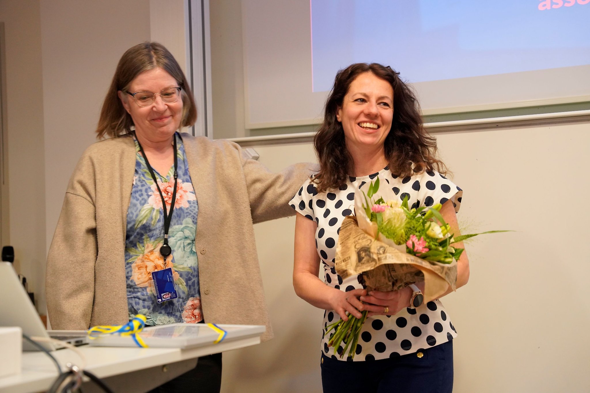 Paraskeva Wlazlak tar emot ett diplom av Annika Moscati, docent på JTH, som intygar att hon har blivit godkänd på sin docentföreläsning.