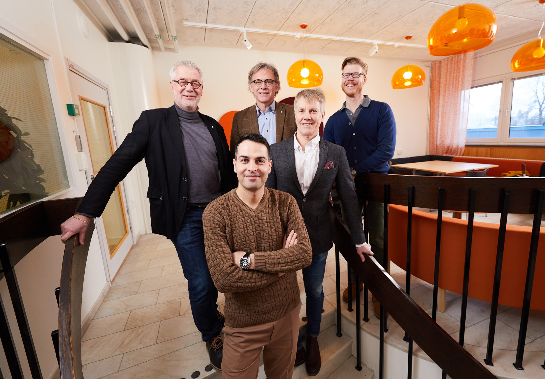 Amir Pakpour with researchers at the School of Health and Welfare during his 2016 when he was a guest lecturer and postdoctoral researcher. From left: Bengt Fridlund, Dan Malm, Anders Broström and Henrik Jansson. Amir Pakpour is in the front. Photo: Patrik Svedberg