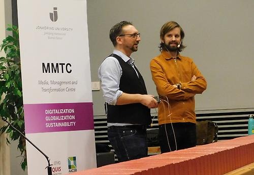 Brian McCauley (on left), MMTC researcher and founding member of the Esports Research Network, introduces guest speaker Tomas Lyckedal, Chief Strategy Officer at Dreamhack AB.