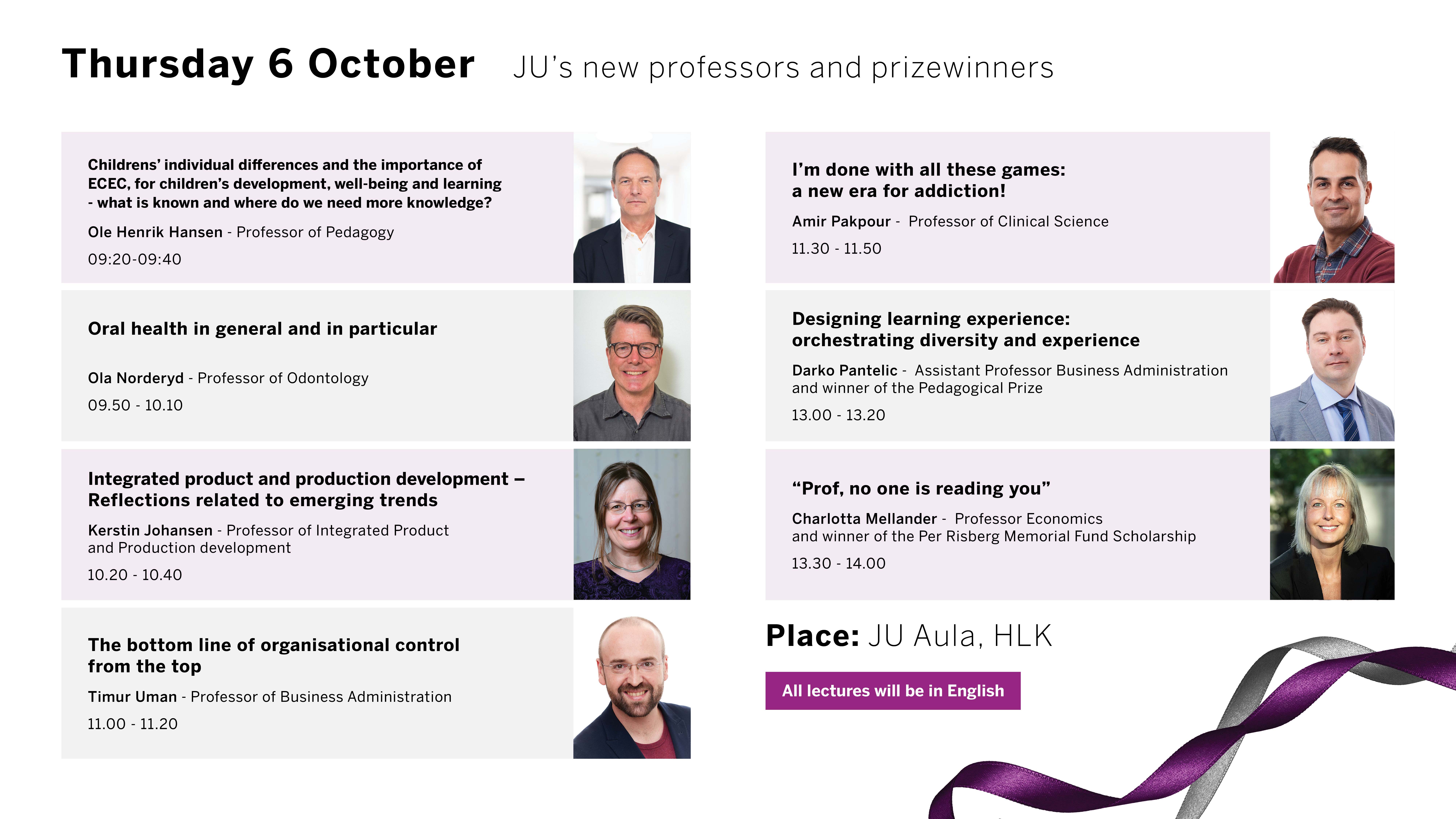 The Thursday public lectures will be given by those professors who will be inaugurated at the Academic Ceremony as well as the winners of the Pedagogical Prize and Per Risberg Memorial Fund Scholarship. The moderator for the Thursday public lectures is Ulli Samuelsson, Associate Dean of Education at the School of Education and Communication.