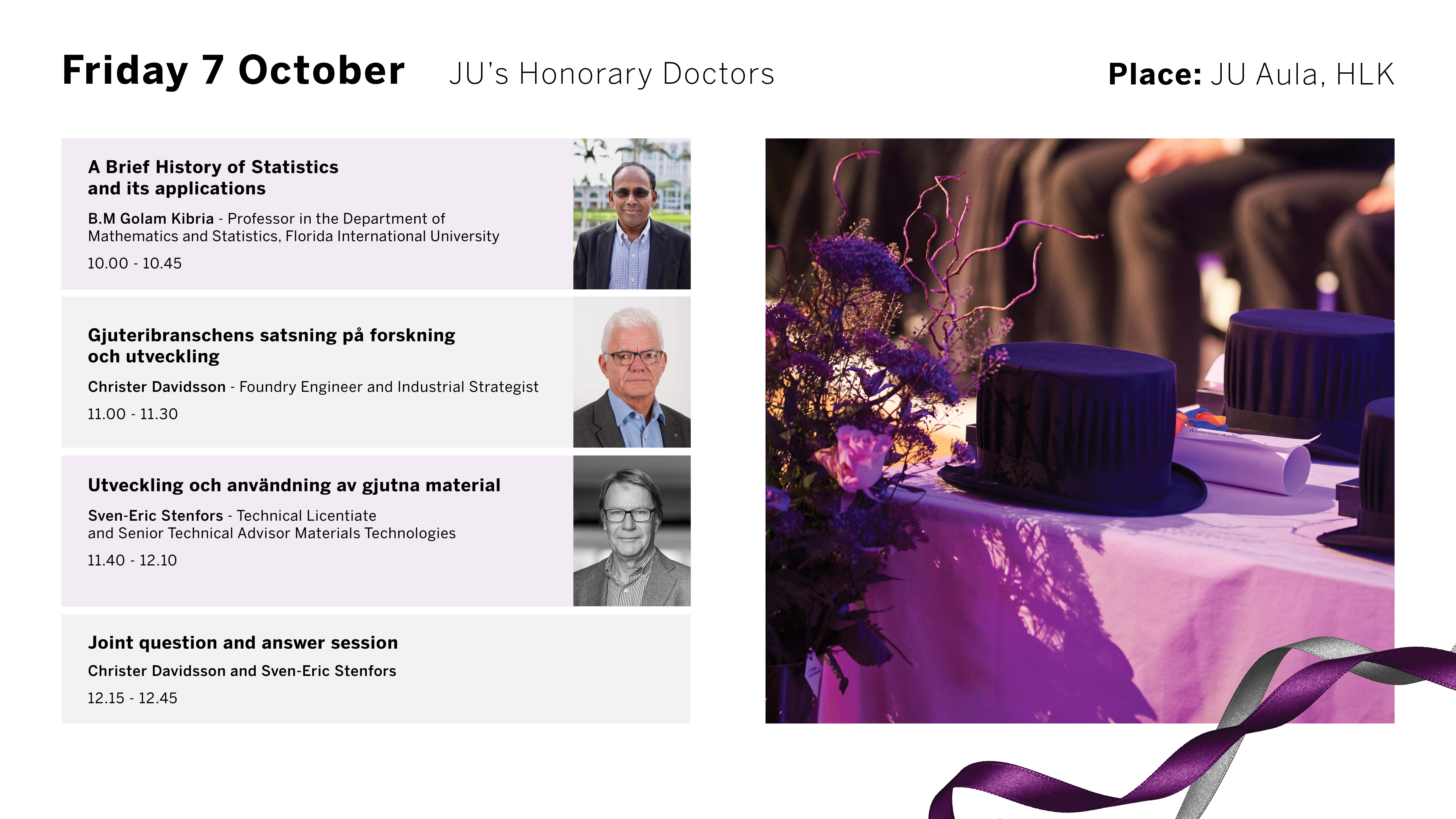 The Friday public lectures will be given by JU's newly appointed honorary doctors. The moderator for the Friday public lectures will be Salem Seifeddine, Associate Dean of Research at the School of Engineering.