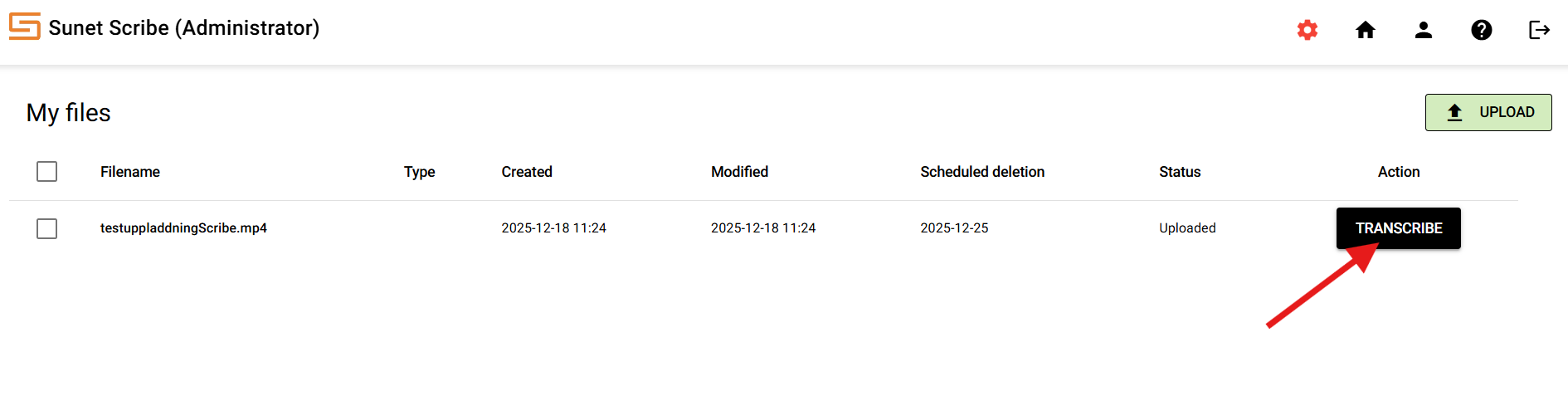 The status of your file will now change first from uploaded to transcribing and then when it is ready to completed. It is important to know that your file will only be saved in Scribe for seven days from the time you uploaded it and then it will be deleted automatically. You can see the date when deletion will take place under "Scheduled deletion". When your file is finished transcribing, press "EDIT" to see the result.