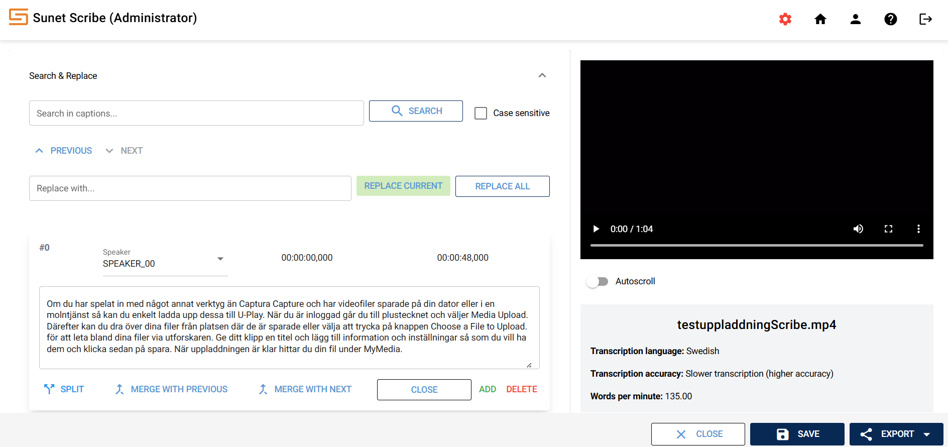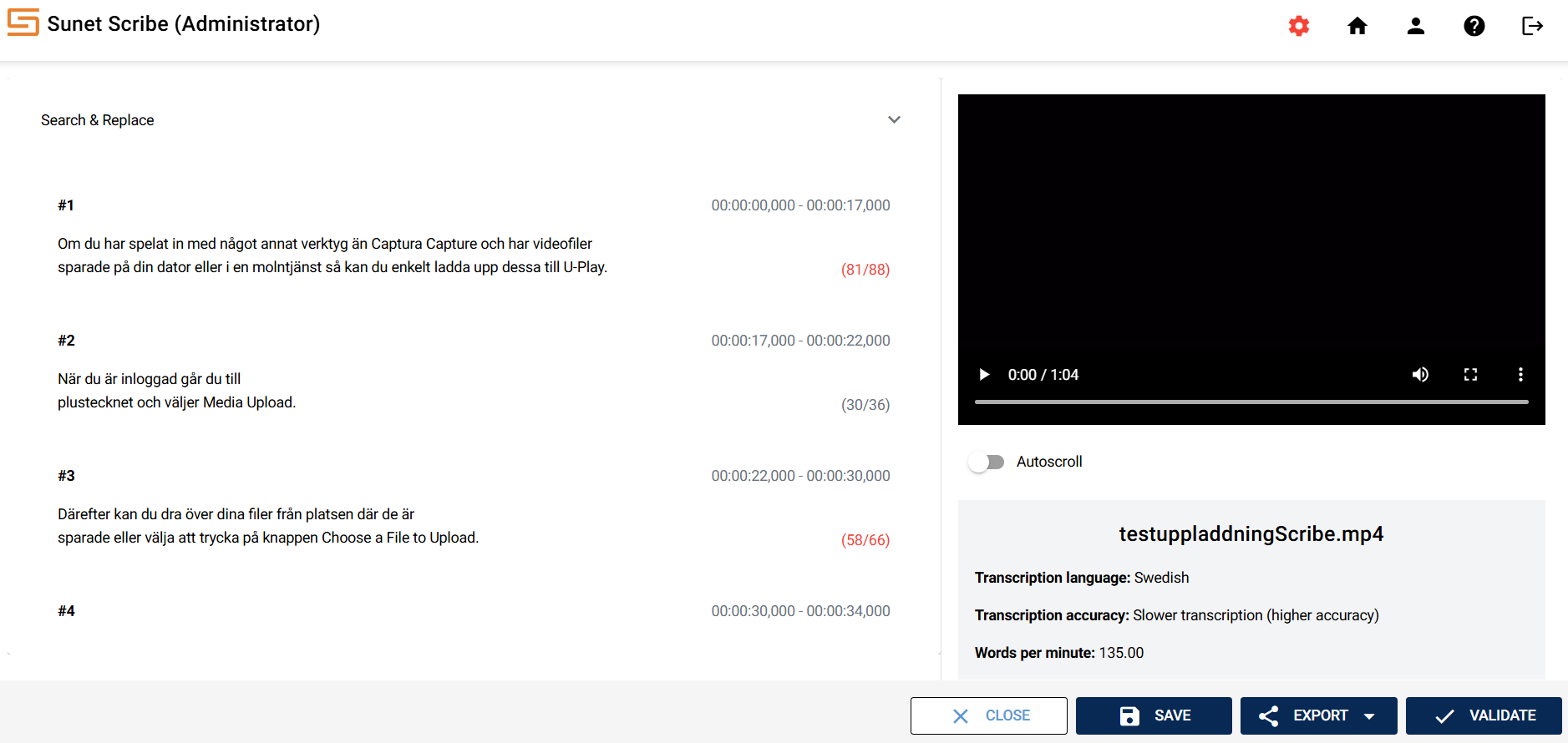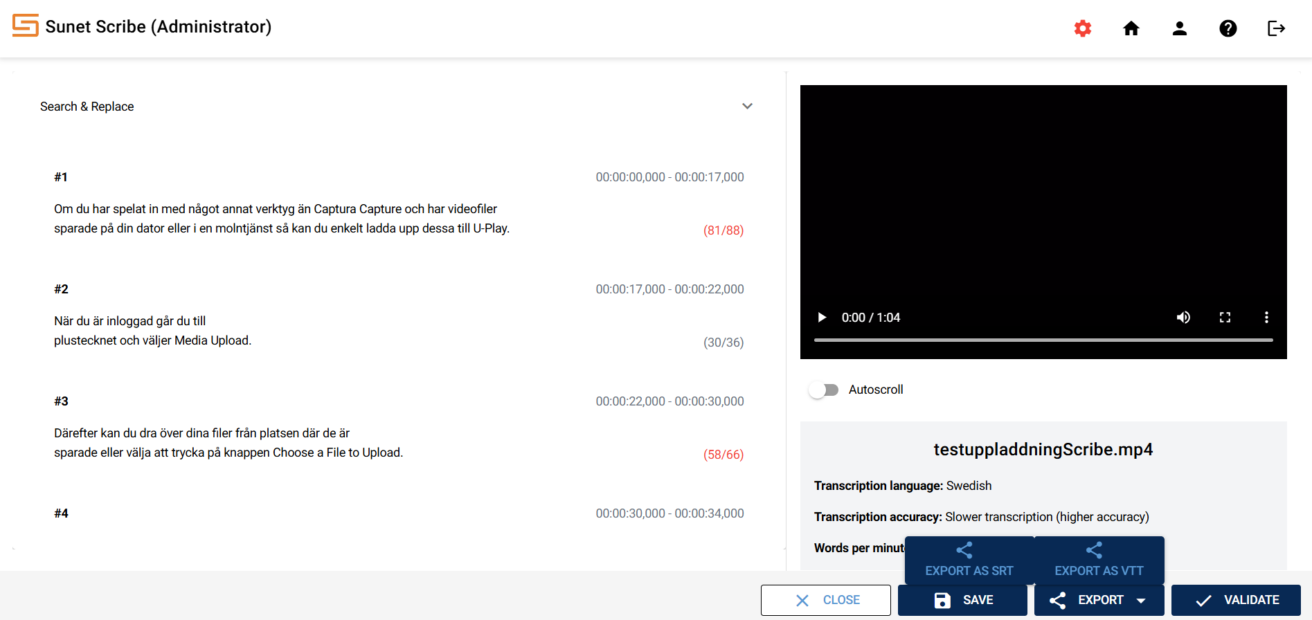 Sunet Scribe is a speech-to-text service (subtitling and transcription of audio and video files) developed by Sunet for the research and education sector. The service is based on open technologies, including the KB Whisper language model, which has been fine-tuned for Swedish by the National Library of Sweden. Transcription and processing is done within Sunet's own data center in Sweden, without external subcontractors.