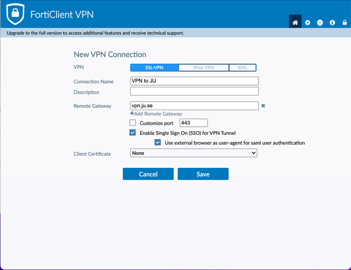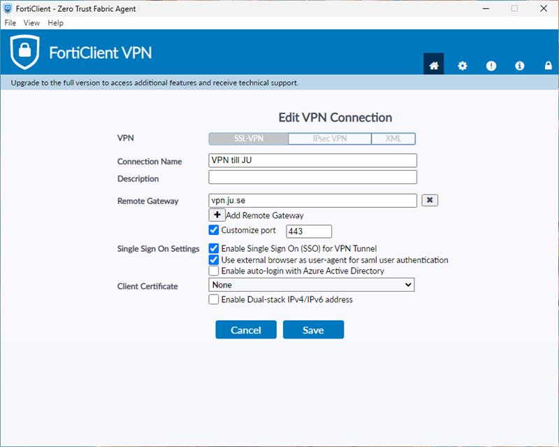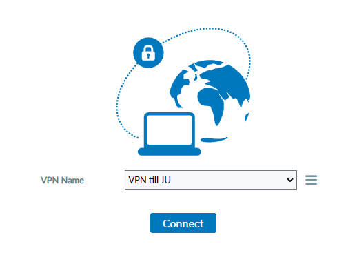 Go to the page https://vpn.ju.se External link, opens in new window. and click on "Single Sign-On". Log in with your JU account (email address).