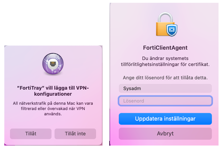 Most JU computers have the VPN client installed. Open the Start menu and search for FortiClient. FortiClient normally starts automatically and then has an icon in the system tray. If FortiClient is not installed, it can be installed from "Företagsportalen" ( "Company Portal") found in the start menu, when you've started Företagsportalent search for FortiClient. If this is the first time you start Företagsportalen, you need to choose the type of device you are using. If it is a JU computer (PC), select JU Employee Windows PC.