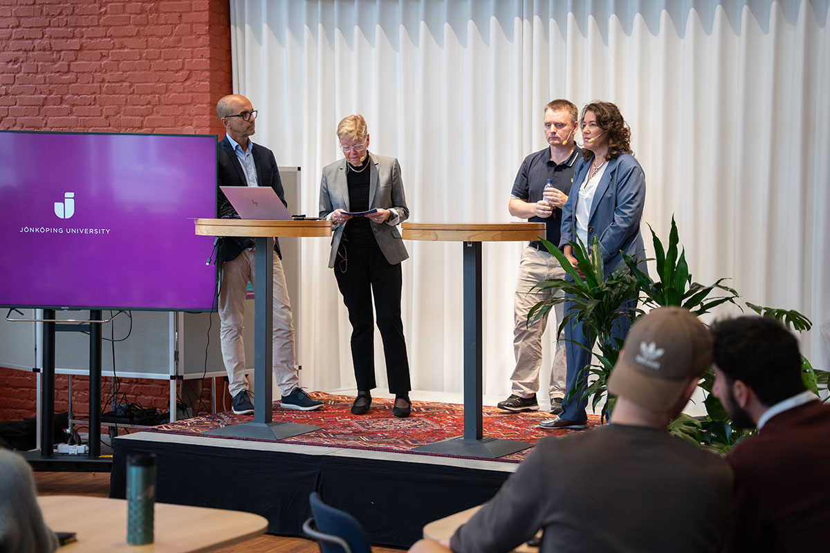 Från vänster: Anders Jonzon, kommunikationschef JU och moderator, Ann Aldén, Ulf Johansson och Annika Engström.
