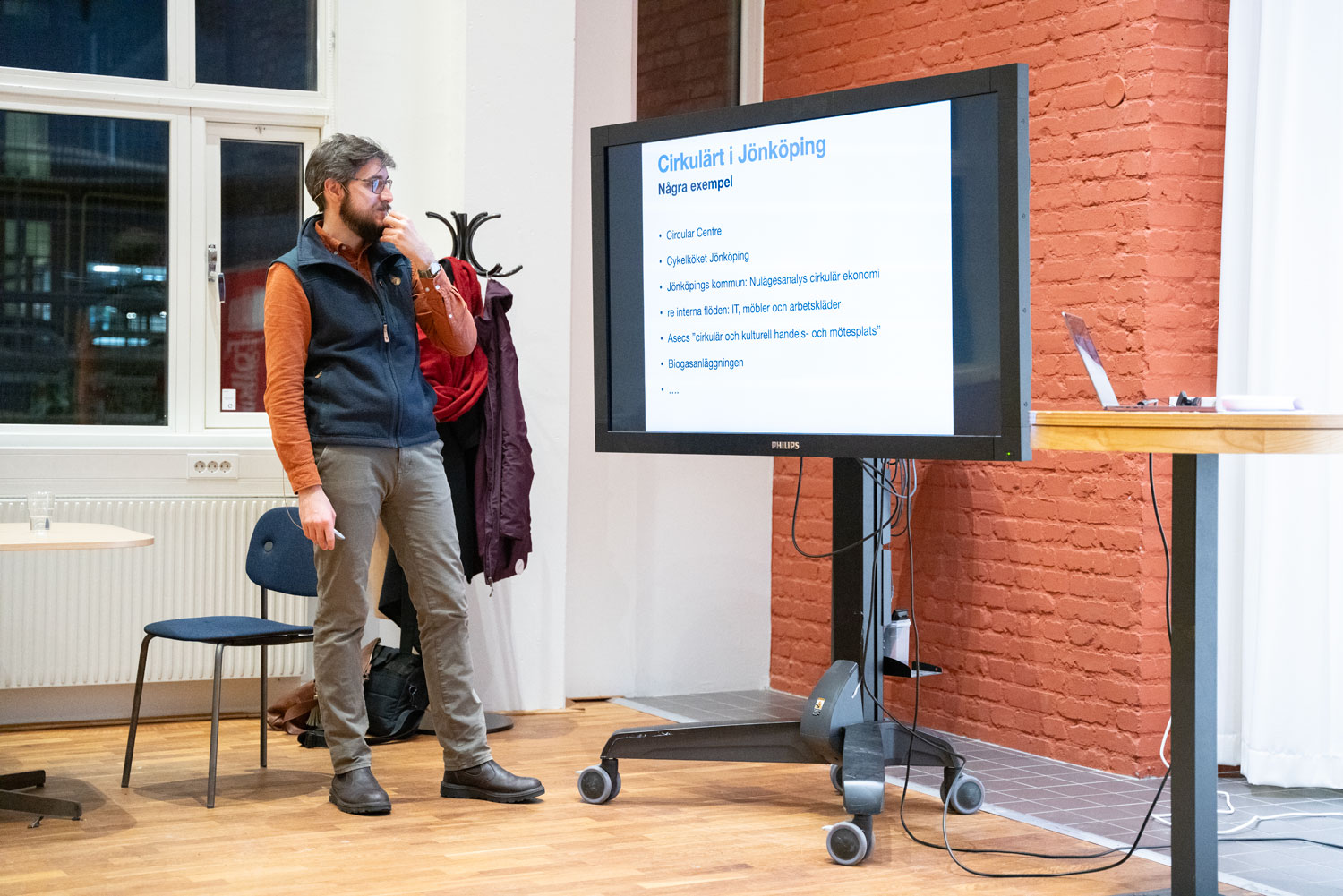 Torsdagen 30 november var det dags för årets sista upplaga av föreläsningsserien JU LIVE. Dagens talare var Thomas Cyron, universitetslektor i företagsekonomi på Jönköping International Business School (JIBS), Jönköping University. Temat var den så kallade cirkulära ekonomin, vad den innebär och hur olika aktörer i Jönköping kan bidra till den.
