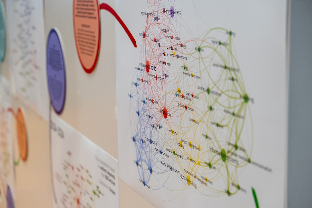 Högskolebiblioteket tar fram nätverksvisualiseringar som visar hur forskning publiceras, citeras och samverkar. Dessa visualiseringar är inte bara till för utställningen, utan används även av forskningsmiljöerna för att identifiera styrkeområden och analysera utvecklingspotential. Genom att visa upp en stark forskningsprofil och tydliga samarbeten kan visualiseringarna också bidra till att stärka ansökningar om forskningsmedel eller examenstillstånd.