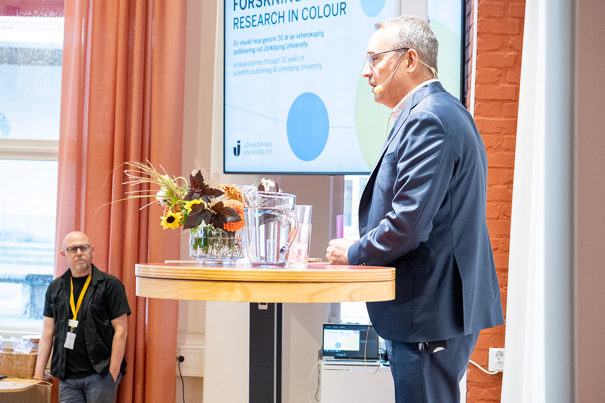 Den 16 september invigdes Högskolebibliotekets nya utställning ”Forskning i färg – en visuell resa genom 30 år av vetenskaplig publicering vid Jönköping University”. Genom färgstarka visualiseringar får besökare en unik inblick i hur forskningen vid högskolan har vuxit, förändrats och blivit alltmer sammanflätad sedan Stiftelsen Högskolan i Jönköping bildades 1994. Rektor Måns Svensson invigningstalade och det följdes av ett panelsamtal med representanter från alla fackhögskolor.