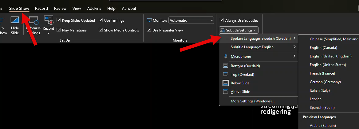 På samma plats finns också inställningen för vilket språk du vill att undertextningen ska vara på. Det kan vara samma språk som det talade språket men det går även bra att powerpoint automatöversätter till ett annat språk. Med andra ord kan du exempelvis prata svenska och få undertextningen på engelska, eller tvärtom.