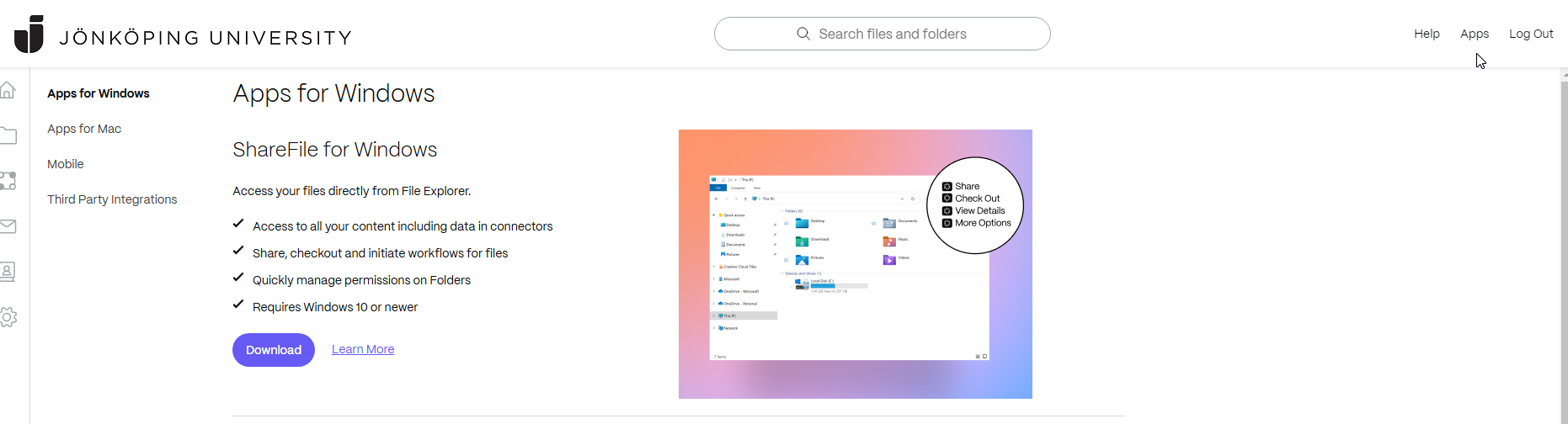 Du kommer åt mappar och filer via en webbsida och du kan också installera programvaran ShareFile Desktop App för enkel åtkomst och automatisk inloggning. Appen finns för nerladdning via webbsidan, i övre högra hörnet.