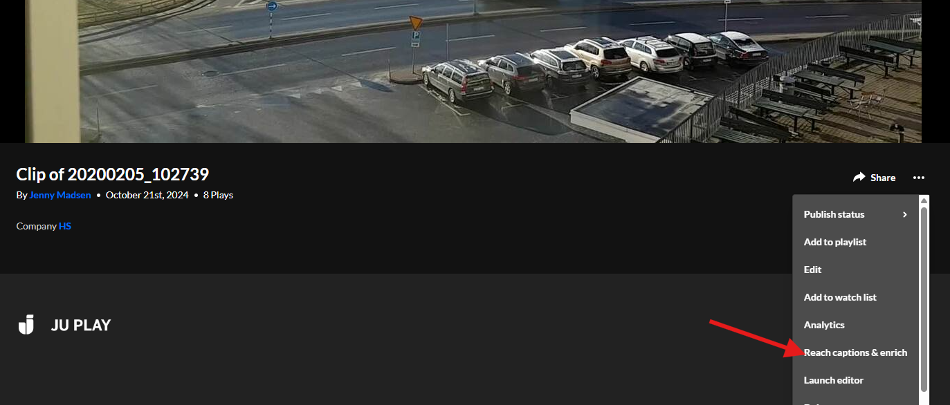 Vill du återkomma till att redigera din undertextning vid ett senare tillfälle hittar du redigeringsverktyget på samma ställe där du beställde undertextningen, dvs du klickar på din video inne i JU Play och klickar sedan på de tre prickarna bredvid Share-knappen och väljer Reach captions & enrich. Därefter klickar du på penn-ikonen.