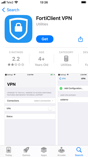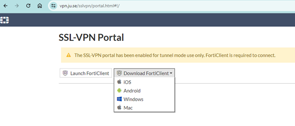 På JU-hanterade mobila enheter distribueras FortiClient VPN automatiskt. Ladda ner appen FortiClient VPN via AppStore eller via ”Play Butik” om du använder en privat enhet.