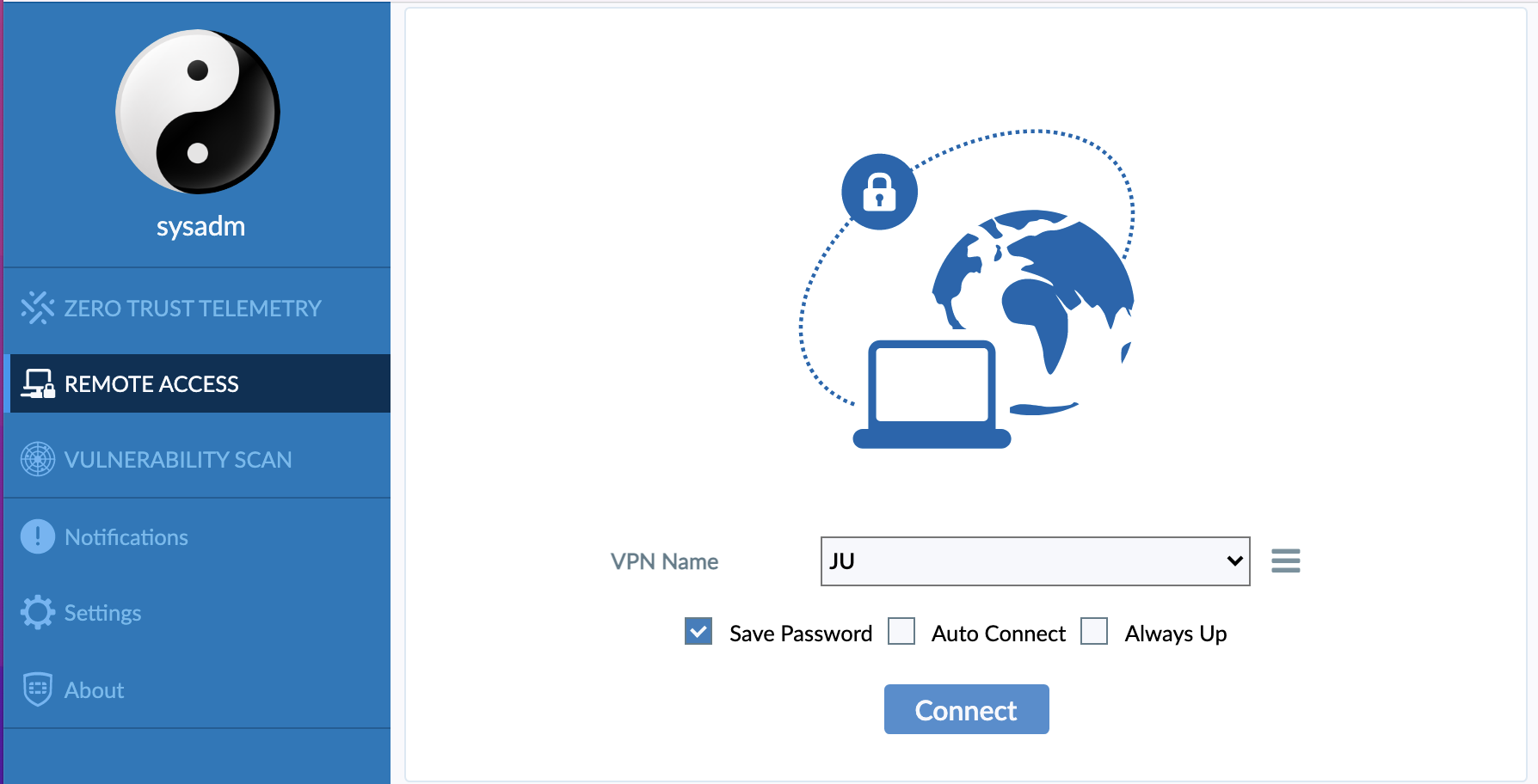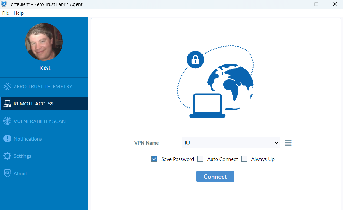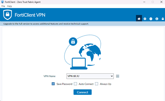 De flesta JU-datorer har VPN-klienten FortiClient installerad. Öppna startmenyn och sök på FortiClient. FortiClient automatstartar normalt sett och har då en ikon i systemfältet. Om FortiClient inte är installerad så kan den installeras från ”Företagsportalen” (alternativt "Company Portal") som du kan hitta via startmenyn, sök på FortiClient när du startat Företagsportalen. Om det är första gången du startar Företagsportalen får du välja vilken typ av enhet du sitter på. Om det är en JU-dator (PC) ska du välja JU Employee Windows PC.