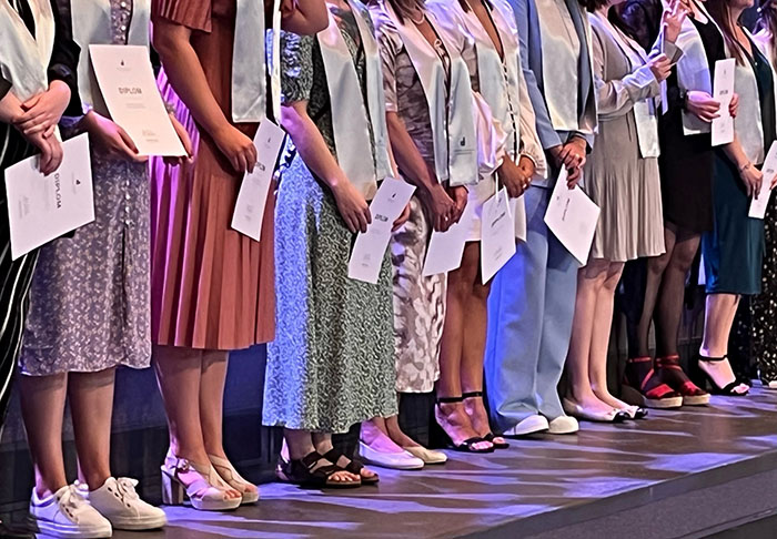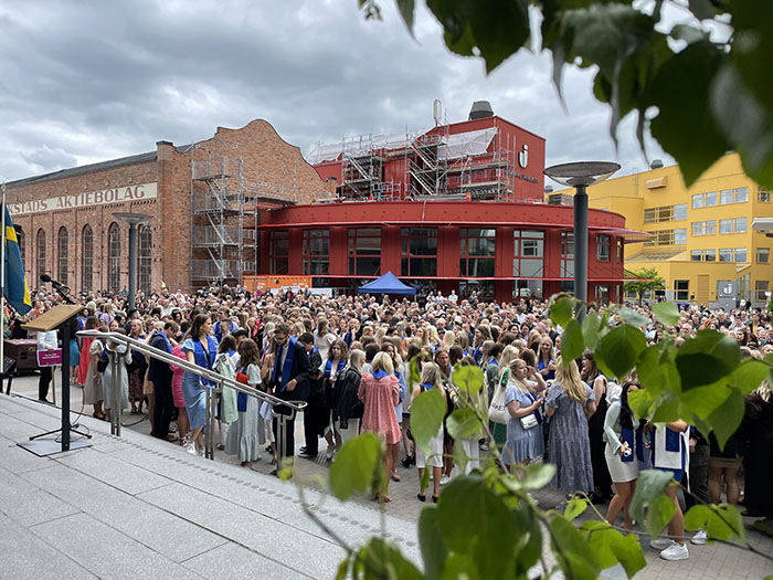 Jönköping University (JU) examinerade i år cirka 1 800 studenter. De fyra fackhögskolorna HHJ, HLK, JIBS och JTH har sina egna avslutningshögtider för studenterna som tar sin examen. Då pandemin har stoppat fysiska avslutningshögtider de senaste två åren var det nu festlig, glädjefull och uppslupen stämning bland alla glada studenter och stolta familjer och vänner i publiken.