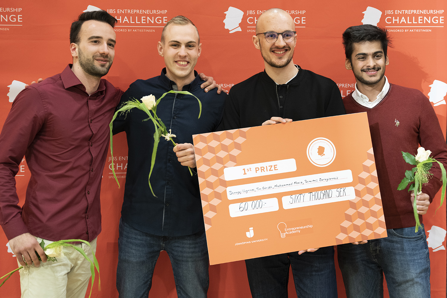 Vinnarna av JIBS Entrepreneurship Challenge 2022, från vänster: Dimitris Zarogiannis, Domagoj Vugrinec, Tim Alexander Görsch, Muhammad Moosa.