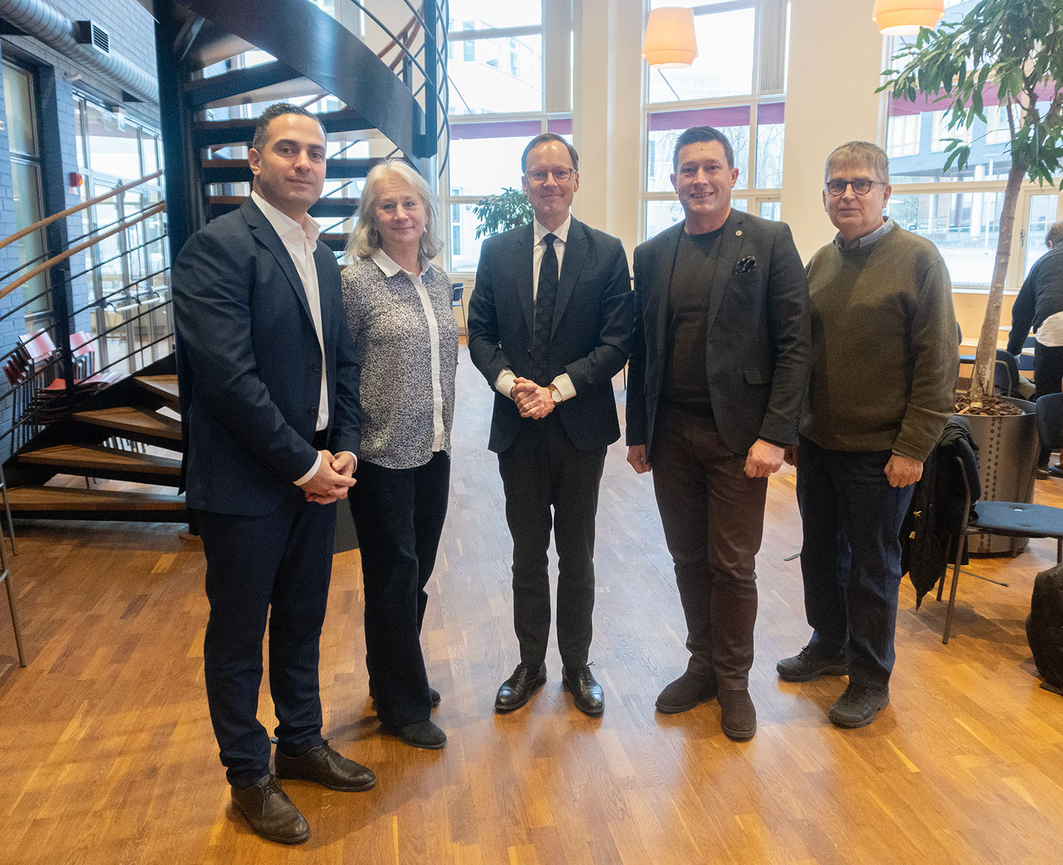 Från vänster: Salem Seifeddine, prorektor, Agneta Marell, rektor, Mats Persson, utbildningsminister, Jimmy Ekström, regionråd på Region Jönköpings län, och Lars Olof Mikaelsson, tjänsteman på Utbildningsdepartementet