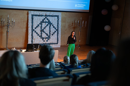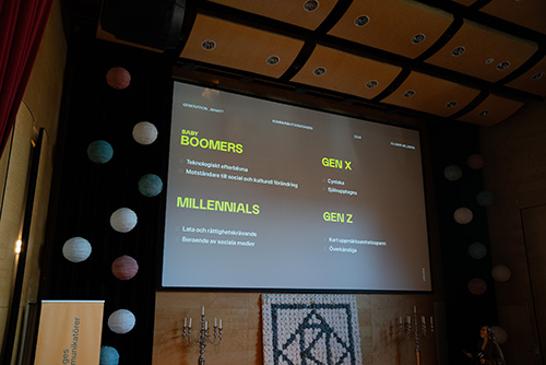 Först ut att föreläsa i JU-aulan var Ellinor Hellberg, grundare och vd på marknadsföringsbyrån Honst, som höll en underhållande och tänkvärd föreläsning om skillnader mellan olika generationer. Ellinor gick igenom varje generation, från Baby Boomers till generation Z. En hel del roliga fördomar avhandlades, men slutsatsen gick ut på att vi kan lära av varandra och vi borde lära oss mer om andra generationer för att själva utvecklas.