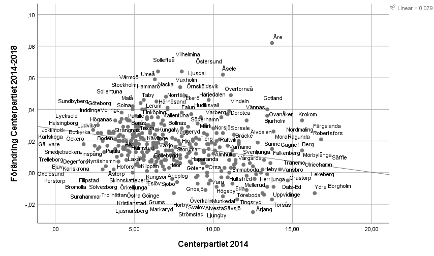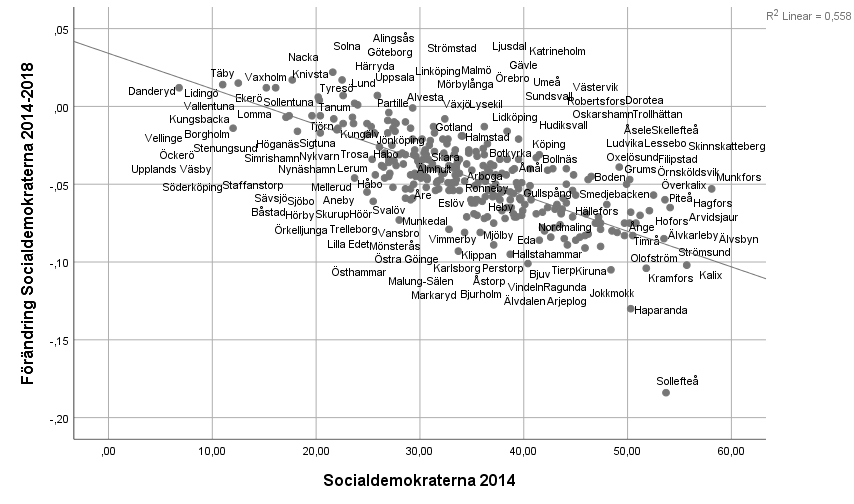Figuren visar tydligt hur partiet tappat flest procentandelar i kommuner där de 2014 fick en högre andel av rösterna. Korrelationen är -0,865 och signifikant.