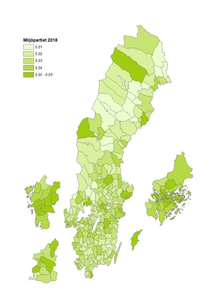 Vi börjar med att se hur kommunerna röstade på Miljöpartiet i detta val. Kartan nedan illustrerar det: