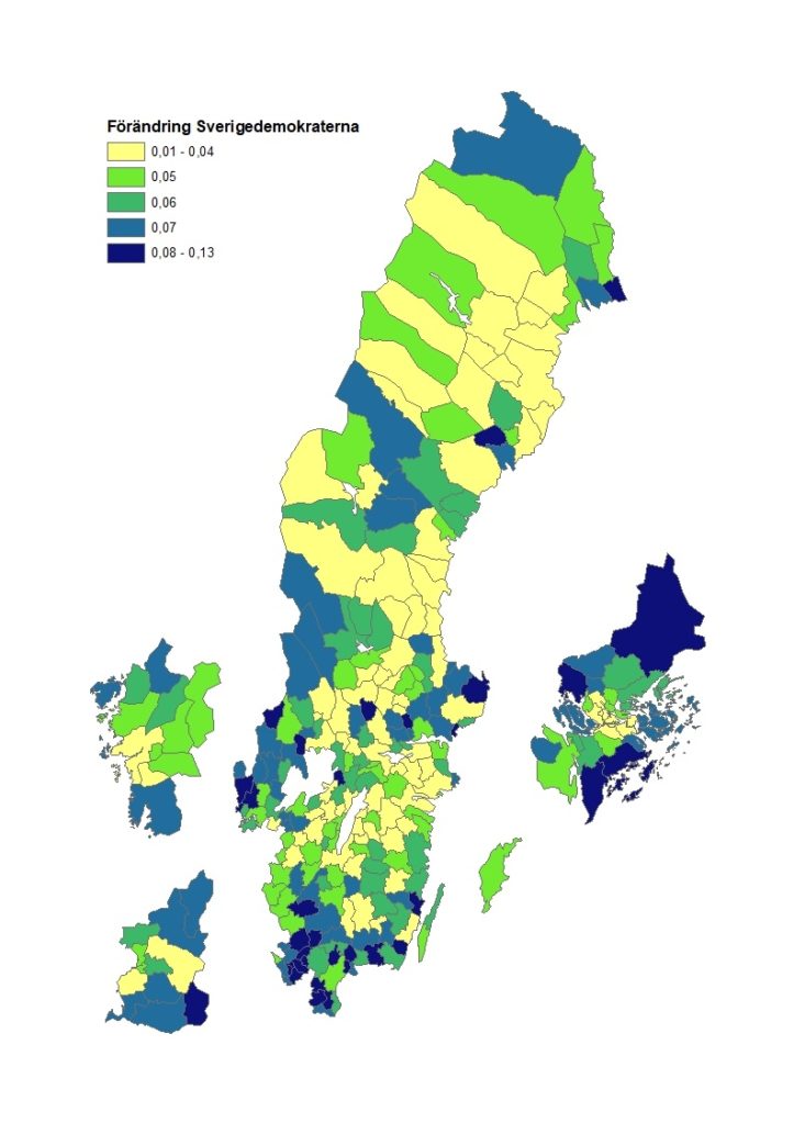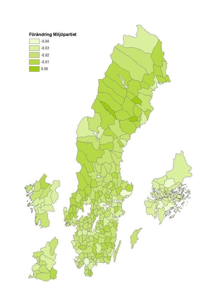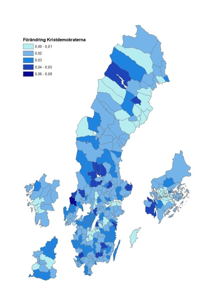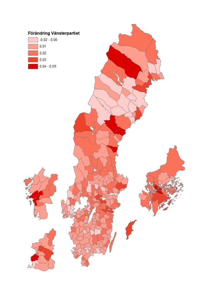 De tre kommuner där de fick högst andel av Munkfors, Hagfors och Piteå, medan de kommuner där lägst andel röstade på partiet var Danderyd, Vellinge och Lidingö. Om vi istället tittar på hur partiets siffor förändrades sedan förra valet så får vi följande karta: