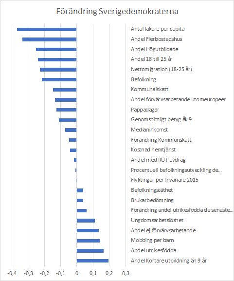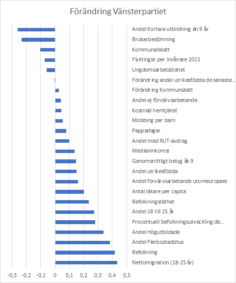 Om vi istället ser på hur dessa faktorer hänger ihop med förändringen sedan valet 2014 så får vi följande figur: