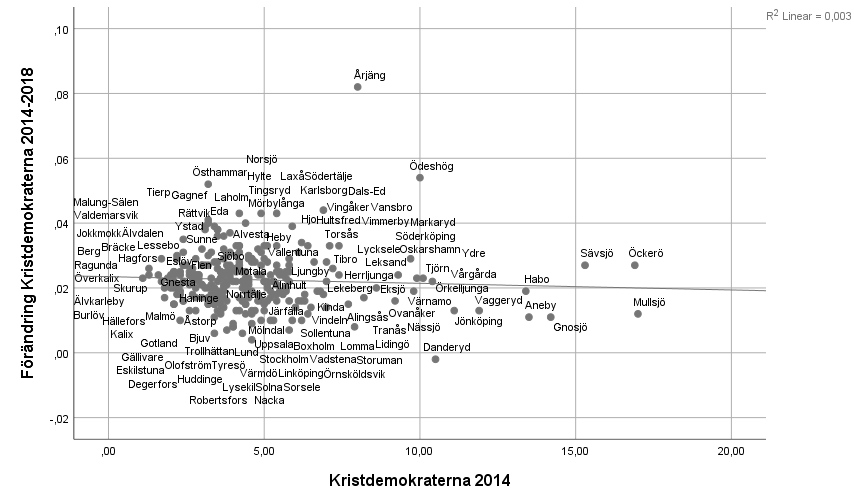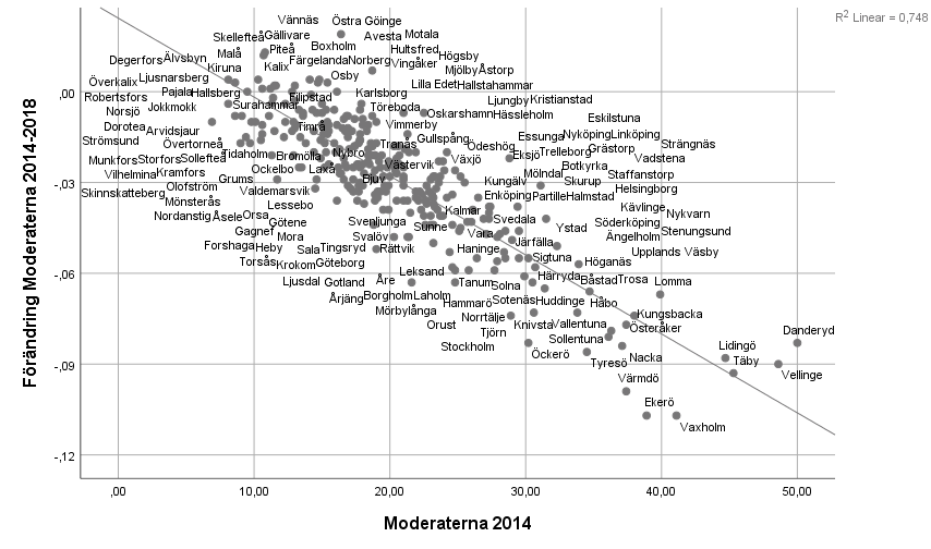 De tre kommuner där man vann flest procentandelar var Stockholm, Nacka och Solna, medan man tappade flest procentandelar i Sollefteå (där tappet var drygt 18 procentandelar), Haparanda och Ragunda. Mer generellt, var det då så att partiet vann/tappade mer i kommuner där de redan 2014 hade ett starkare stöd? Figuren nedan visar förändringen för partiet i relation till siffrorna i valet 2014:
