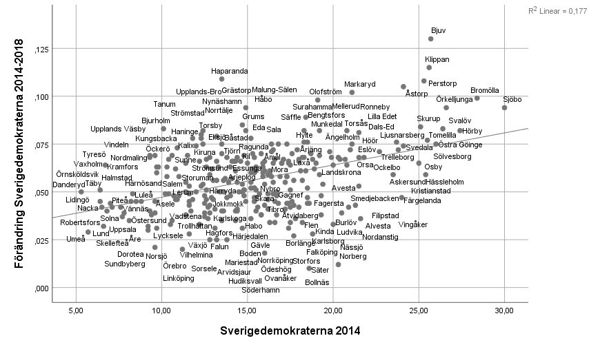 Det finns inga signifikanta samband mellan valresultatet år 2014 och förändringen fram till detta val. Det är alltså inte så att partiet ökat (eller minskat) i högre grad i kommuner där de redan från början hade ett starkare eller svagare fäste.