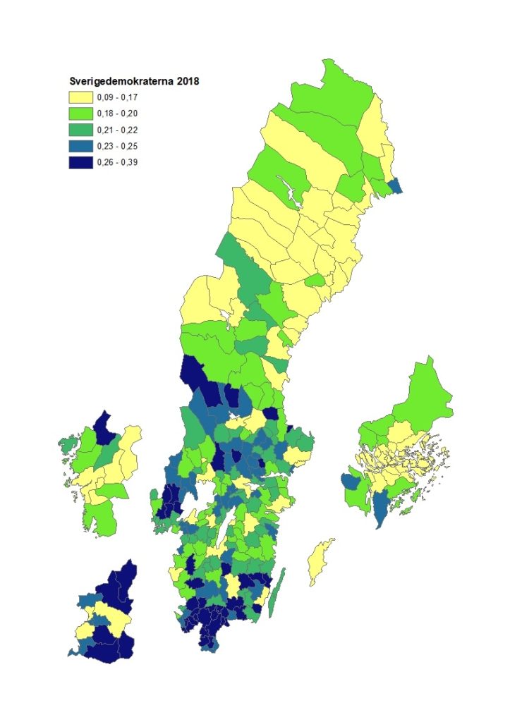 Mest stöd fick partiet i kommuner där en högre andel har en kort utbildning, ungdomsarbetslösheten är högre, en högre andel förvärvsarbetar inte och andelen utrikesfödda i kommunen har ökat de senaste tio åren. Sverigedemokraterna har ett svagare stöd i kommuner med en högre andel högutbildade, fler röstar på Vänsterpartiet, Miljöpartiet och Liberalerna. Det finns en högre andel flerbostadshus och en högre andel av föräldradagarna tas ut av pappan.