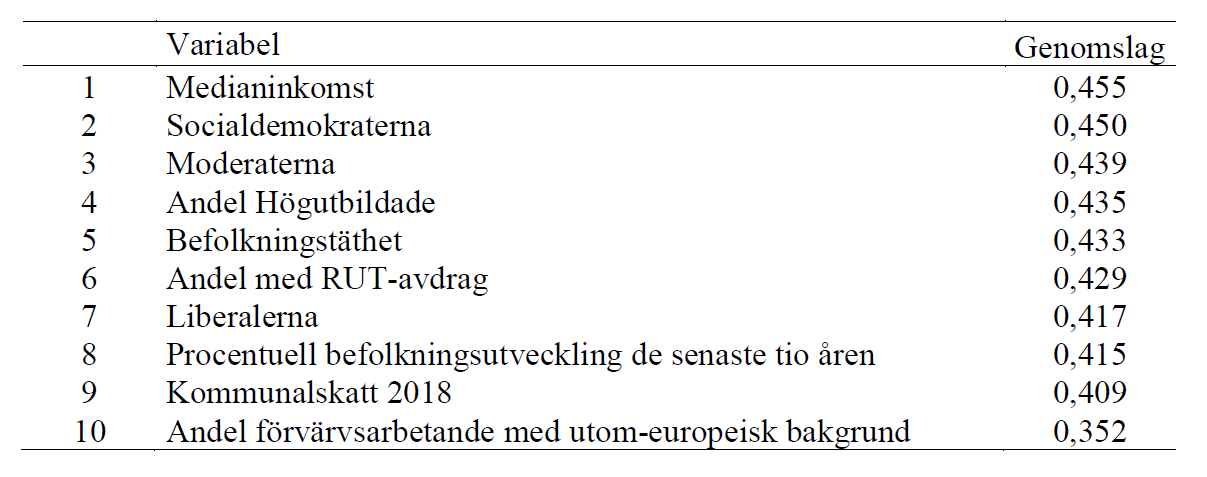 Av de socio-ekonomiska (och politiska) variabler som inkluderades i analysen här – vilka var då starkast relaterade till valresultatet på kommunnivå. Tabellen nedan visar resultatet: