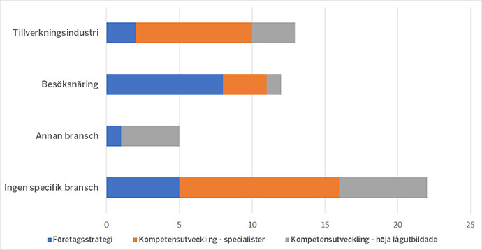 Figur 3 visar att tillverkningsindustrin och besöksnäringen har berörts av flest specificerade insatser. I tillverkningsindustrins fall handlar det främst om nya högskolekurser för att främja digitalisering, medan de flesta insatserna mot besöksnäringen rör utveckling av nya affärsmodeller. Majoriteten av insatserna har dock inte haft någon specifik bransch i åtanke. Även bland dessa sticker högskolekurser ut, i många fall med digitaliseringstema.