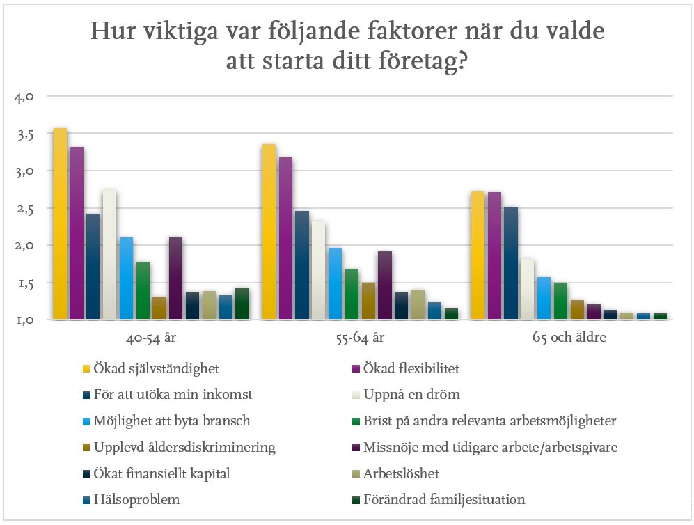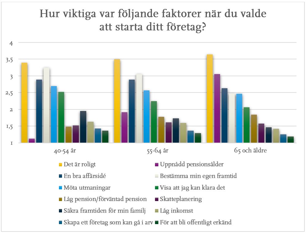 Vi analyserade svaren och jämförde olika åldersgrupper för att se om olika motiv var mer relevanta i olika åldrar. Varje motiv bedömdes enligt en skala där 1) betyder inte alls viktigt, 2) betyder lite viktigt, 3) betyder ganska viktigt och 4) betyder mycket viktigt. Ju högre siffra, desto viktigare var det specifika motivet för de svarande att starta sina företag. Eftersom enkäten innehöll många olika alternativ presenteras resultaten i två olika diagram. De svar som visas i figurerna består av de 840 individer som drev sina företag aktivt när de svarade på enkäten. Svaren presenteras uppdelat på tre åldersgrupper: 40–54 år; 55–64 år; samt 65 år och äldre.