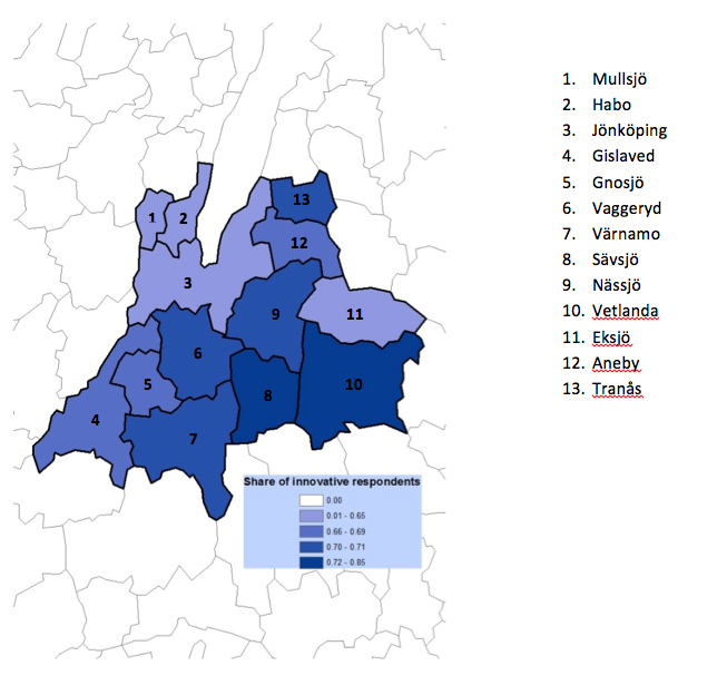 I kartan nedan ser vi hur innovativa företagen är i respektive kommun. Mörkare fält säger att en större andel av de som har svarat på enkäten säger att de har varit innovativa de senaste åren. Det är viktigt att poängtera att det av naturliga skäl är fler som svarat från Jönköpings kommun men kartan indikerar ändå att det är en relativt stor andel av Jönköpings läns landsbygdskommuner som faktiskt sjuder av innovativ aktivitet. Överlag så är nära 70 % av de som svarat innovativa.