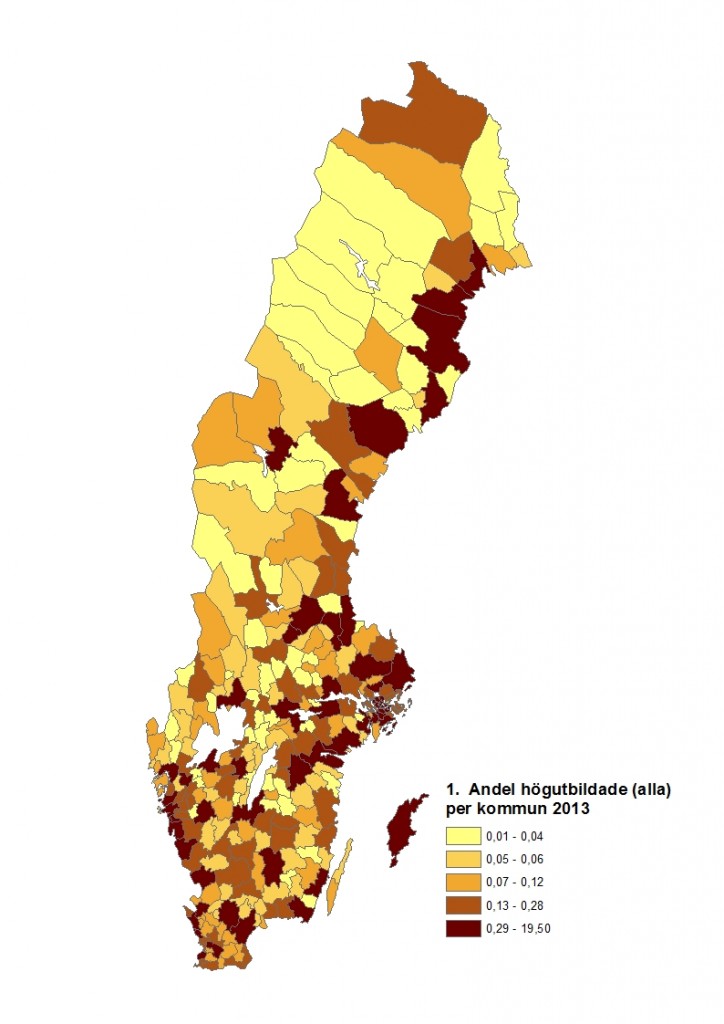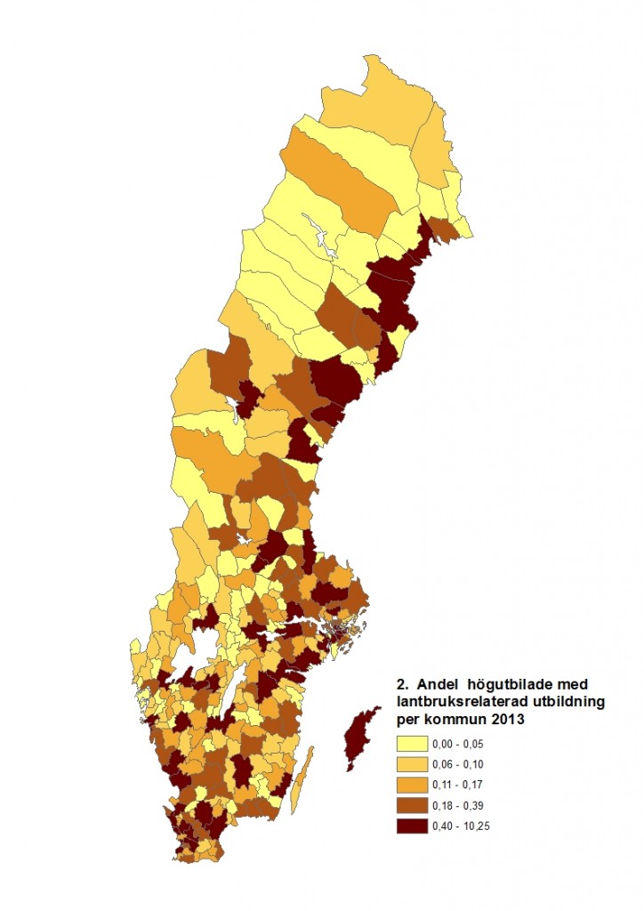 Utifrån detta är det intressant att ser se var de högutbildade finns i Sverige och om det skiljer sig mellan kunskap som är relaterad till jordbruk och annan kunskap. Den första kartan nedan visar fördelning av alla högutbildade över Sveriges kommuner. Karta nummer två visar samma sak för alla högutbildade med en jordbruksrelaterad utbildning. Med blotta ögat ser vi att skillnaderna mellan de båda är relativt små vilket indikerar att även jordbruksrelaterad högre utbildning tenderar att dras mot tätare platser. Med den utveckling vi har sett inom jordbruket så kan kompetensförsörjning inom jordbruket på Sveriges landsbygder antas stå för samma utmaningar som andra industrier. Men jordbruket har ”handikappet” att de inte kan välja lokalisering efter kunskapens placering i Sverige.