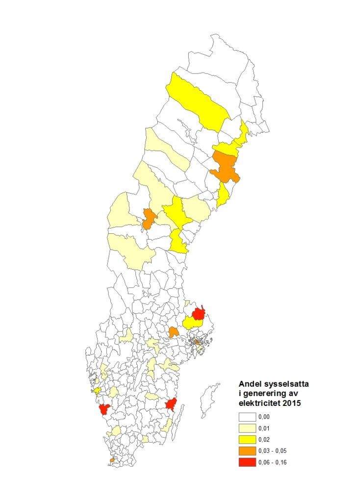 Landsbygdens dominans beror på platsbundna faktorer så som vatten men det handlar även om att denna typ av produktion kräver stora ytor, vilket är fallet med kärnkraften och även vindkraften. Man producerar på landsbygden och bygger sedan distributionsnät in till staden. Men någon på landsbygden måste finnas där för att sköta produktionen och den andra kartan visar andelen av alla dessa sysselsatta per kommun.