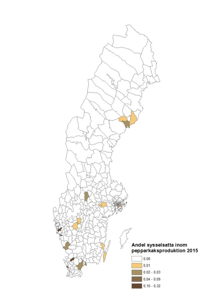 Juletid är en tid för sötsaker och kanske ligger pepparkakan i topp (i hård konkurrens med lussebullen). Vi är även en god exportör av denna juliga kaka. Om vi tittar på produktionen av kex och konserverade bakverk, där pepparkakan ingår, ser vi att landsbygderna levererar en betydande mängd. Mer än 30 % av de som är sysselsatta inom denna typ a kakproduktion jobbar i en landsbygdskommun. Örkelljunga, Nordmaling och Hällefors är exempel på landsbygdskommuner som hamnar i toppstriden med många sysselsatta inom detta.