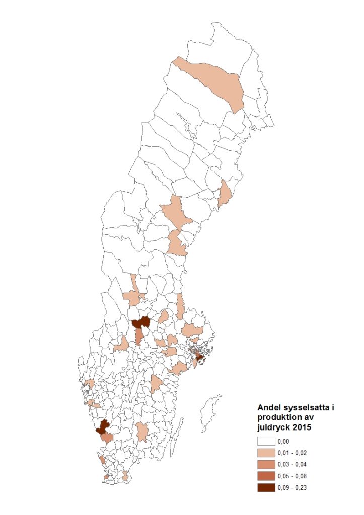 Till maten krävs drycker, med eller utan alkohol. Den senaste tidens snabba utveckling av mikrobryggerier får till följd att många kommuner har denna typ av produktion och många av dessa har växt fram nära de större marknaderna. Men det har även skapat möjligheter för landsbygdskommuner och det ser vi i kartan nedan som visar kommuners andel av sysselsatta inom produktion av glögg, öl, svagdricka och läsk. Många kommuner utanför Stockholm, Göteborg och Malmö har numera denna typ av produktion. Hällefors och Sollefteå tycks vara sådana exempel.