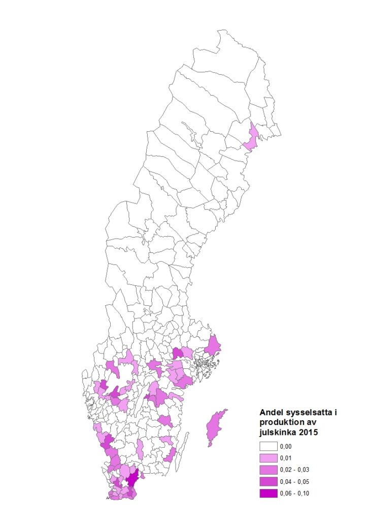 Om man övergår till vad vi lägger på våra matbord under julhelgen så kommer mycket från landsbygden. Mjölken till gröten, äggen till omeletten och mjölet till lussebullarna. Och för att inte tala om julskinkan. Kartan nedan visar hur de sysselsatta inom slaktsvinsproduktion är fördelade över Sveriges kommuner. I mer beskrivande ord så kan man säga att av de 89 kommuner som producerar slaktsvin, så är 43 stycken landsbygdskommuner vilket är 32 % av de sysselsatta inom produktionen. Det visar tydligt att en relativt stor andel av våra svenska julskinkor produceras på någon av Sveriges landsbygder.