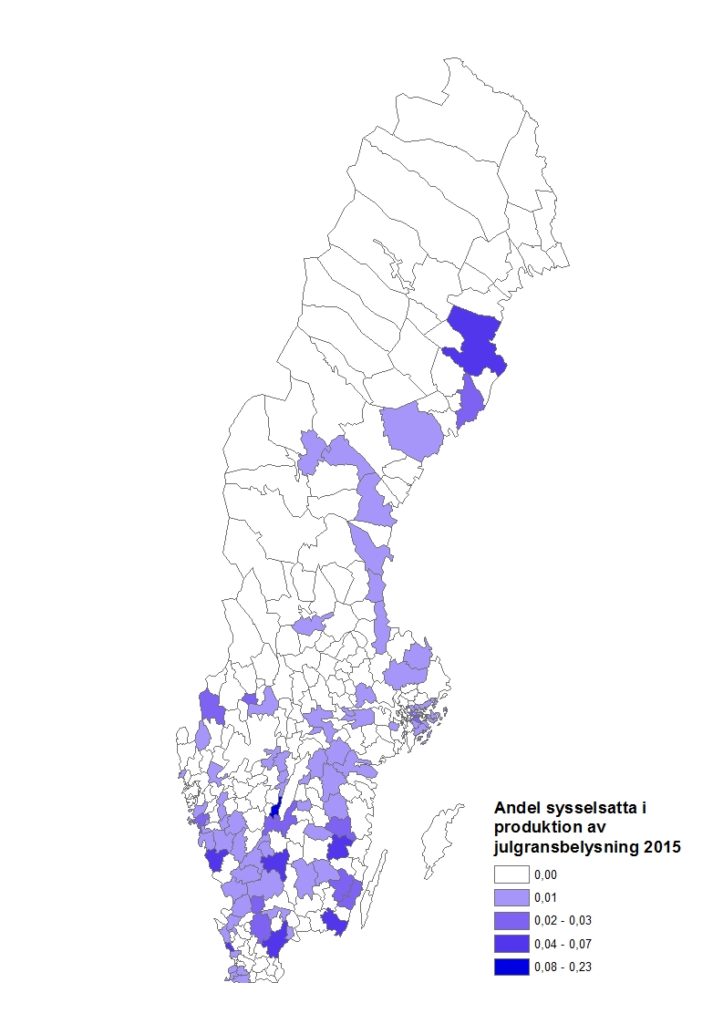 Vi kan då även passa på att se om de svenska lamporna som tänds i granen är en produktion i städer eller på landsbygderna. Många av de markerade kommunerna i kartan nedan kategoriseras som landsbygder och nära 30 % av alla sysselsatta inom ”tillverkning av belysningsarmatur” finns anställda i någon av våra landsbygdskommuner.