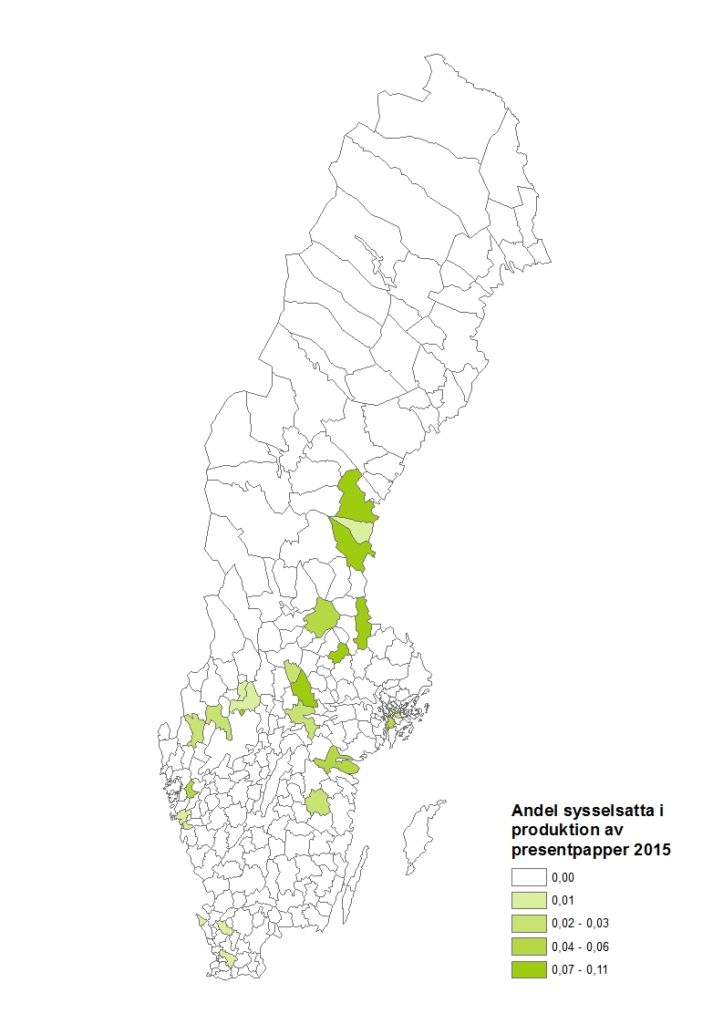 En viktig del av julen är att ge gåvor och vi gillar att smycka dem med vackert papper och glittrigt snöre. I de fall då inslagningsattributen är inhandlade i Sverige kan det mycket väl vara producerat i någon av våra landsbygdskommuner. Mer än en tredjedel av alla sysselsatta inom presentpappersproduktion finns anställda i en av Sveriges landsbygdskommuner. Många landsbygdskommuner hamnar på topplistan av arbetsgivare så som exempelvis Hudiksvall, Lindesberg, Lilla Edet, Bengtsfors, Kinda, Ljusnarsberg, Nordanstig och Höganäs. Vad det gäller presentsnörena så är mer än 80 av de sysselsatta inom produktionen anställda i en landsbygdskommun. Mark, Borgholm, Gotland och Tierp är alla exempel på landsbygdskommuner som levererar till detta.