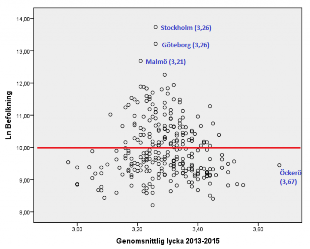 Om vi plottar medellycka i kommunen (x-axeln) mot LN befolkningsmängd (y-axeln) ser vi att kommuner med större befolkningsstorlek varierar mindre i medellycka än kommuner med en mindre befolkningsstorlek. Det är tydligt att den genomsnittliga livstillfredsställelsen i mindre kommuner varierar mycket och att dessa kommuner besitter såväl de högsta som de lägsta lyckonivåerna (kommuner med lågt enkätdeltagande har exkluderats i hela bloggposten). I figuren har jag märkt ut Sveriges tre största kommuner; Göteborg, Stockholm och Malmö. Stockholm och Göteborg har en genomsnittlig nöjdhet på 3,26 vilket är nära men strax under medel för hela Sverige (3,28) och Malmö har en lägre genomsnittlig nöjdhet på 3,21. Jag har också märkt ut Öckerö, där den genomsnittliga nöjdhetsnivån ligger långt över resterande kommuners. Jag har adderat en rät linje vid befolkningsmängd = LN 10 vilket motsvarar en befolkningsstorlek på drygt 22 000 invånare. Denna linjemarkering förtydligar än mer hur mindre kommuner, med en befolkning på färre än 22 000 invånare (under den röda linjen), är mer varierande och utspridda i genomsnittlig livstillfredställelse än större kommuner.