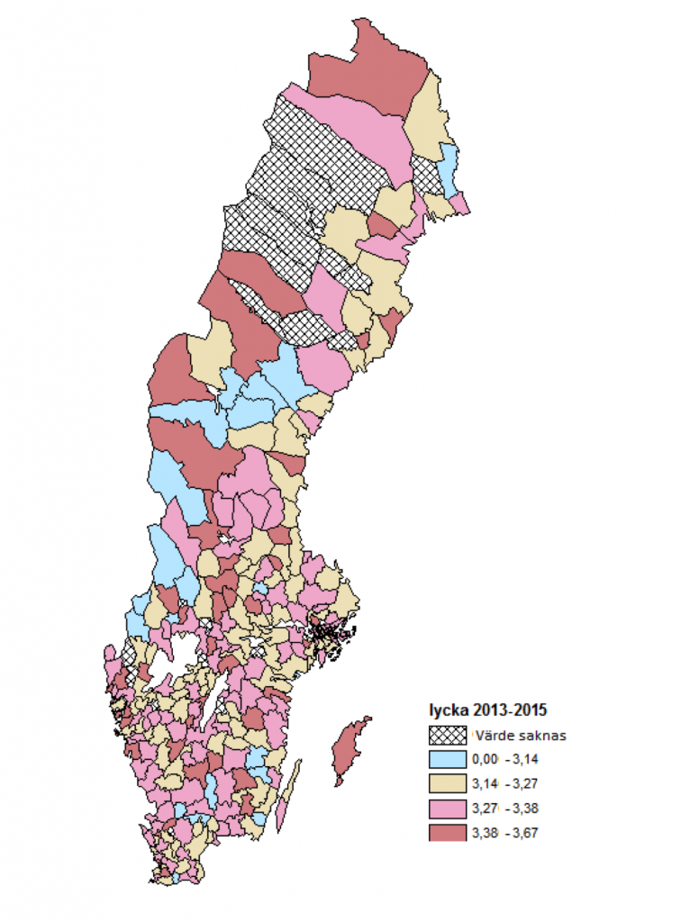 I figuren nedan ser vi en karta över Sveriges kommuner. De blå kommunerna ligger lägst i genomsnittlig lycka, följt av de gula kommunerna. De rosaröda kommunerna har en genomsnittlig lyckonivå lika med eller högre än landets medelvärde, där den mörkare färgen visar högre genomsnittlig lycka än den ljusare. Vissa kommuner saknar värde på kartan, detta på grund av lågt enkätdeltagande i dessa kommuner.