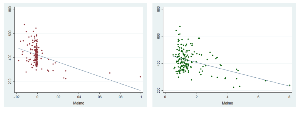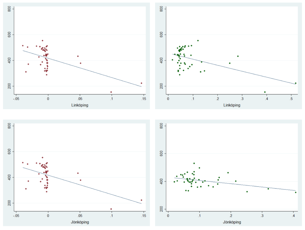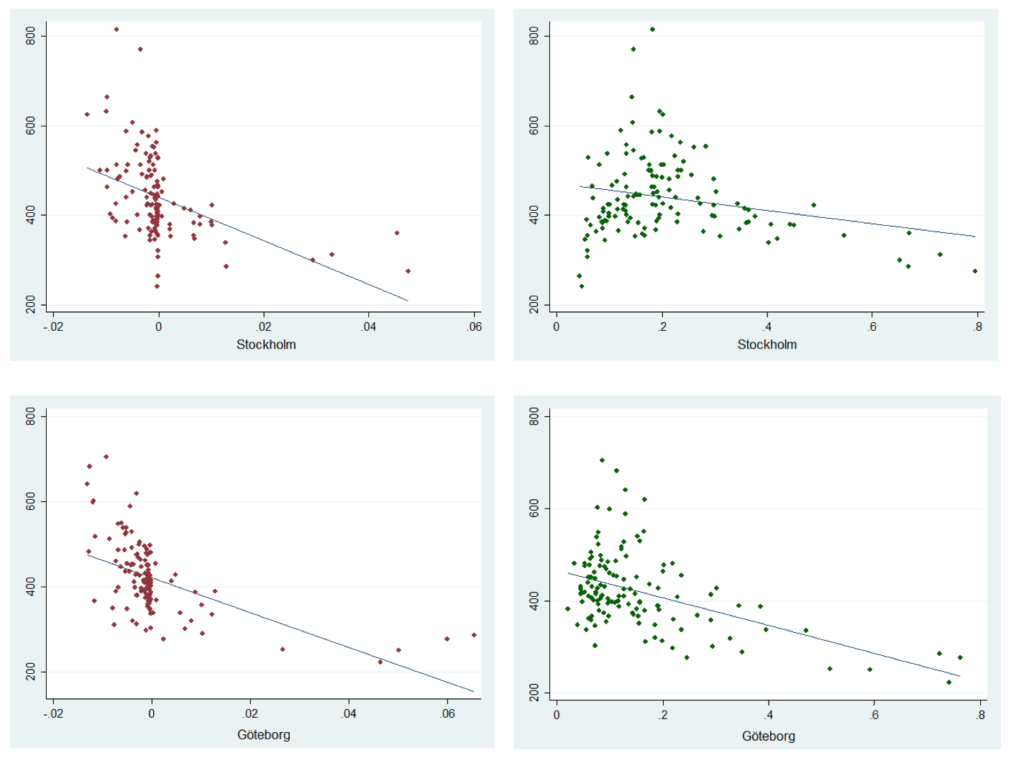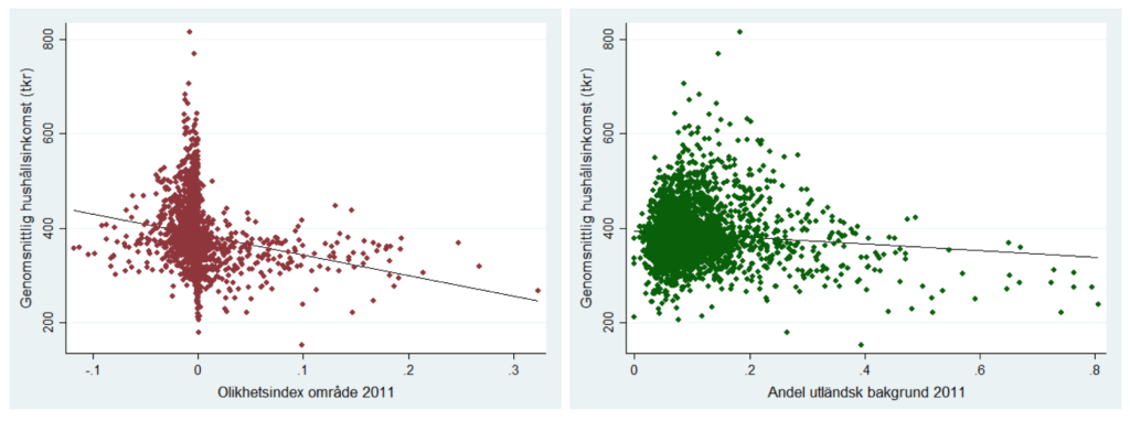 Båda figurerna visar på ett negativt samband mellan segregation och genomsnittlig hushållsinkomst. Vad som är särskilt tydligt från figurerna är att områden där en övervägande andel av befolkningen har utländsk bakgrund är den genomsnittliga hushållsinkomsten uteslutande i det nedre skiktet. Sambanden är dock relativt svaga, vilket framför allt beror på en mycket stor spridning i genomsnittlig inkomst bland områden med lägre grad av segregation. Figurerna ovan tar heller inte hänsyn till att inkomster tenderar att vara högre i städer än på landsbygden. Figurerna nedan visar därför motsvarande samband för ett urval av regioner.