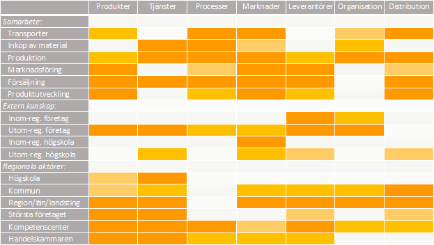Frågan är då om de företag som har ett högre värde på innovationer också har ett högre värde på faktorer som rör samverkan? Vi mäter samverkan i tre olika dimensioner, 1) samarbete med andra aktörer i regionen, 2) källor till extern kunskap för att utveckla nya produkter och tjänster, och 3) betydelsen av regionala aktörer för företagets utveckling. Tabellen nedan visar på dessa samband, där ett fält i orange innebär att det finns ett statistiskt säkerställt positivt samband mellan den form av samverkan som anges i kolumnen till vänster och den typ av innovation som anges i översta raden. Ju mörkare färg desto starkare samband.