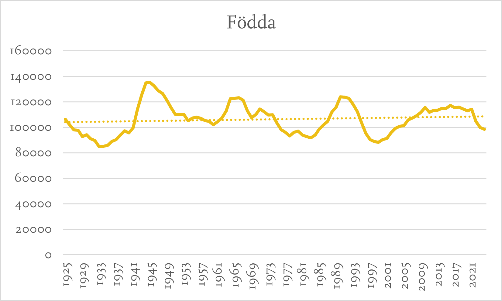 I diagrammet redovisas antalet födda per år under perioden 1925–2024. Det mest slående är de stora svängningarna över tid i antalet födda men där variationen blir allt mindre över tid. Trenden i antalet födda är svagt positiv vilket inte är märkligt eftersom Sveriges befolk­ning vuxit väsentligt under dessa 100 år.