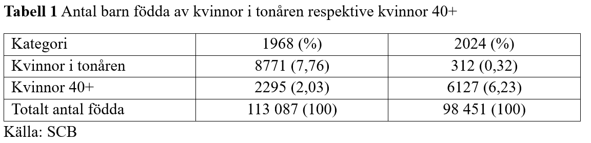 I nästa diagram tittar vi på perioden 1925–2024 och ser i stället på antalet födda barn per kvinna. Trenden är tydligt negativ och även här minskar variationen under de senaste åren. Fö­delsetopparna speglar perioder med ett större antal kvinnor i fertil ålder till följd av be­folkningsutvecklingens cykliska mönster. Vidare tenderar avstån­det mellan topparna att öka, vilket speglar ökad genomsnittsålder hos de kvinnor som fö­der barn. Vi kan exempelvis se att år 2023 var förstföderskornas medelålder 30,39 år, vilket kan jämföras med att den år 2000 var 28,22 år. Den ökade genomsnittsåldern hos de kvinnor som föder barn bely­ses tydligt i tabellen nedan som visar det antal barn som kvinnor i tonåren respektive kvinnor 40+ födde år 1968 respektive år 2024. Förändringen över tid kan bara beskrivas som dramatisk.