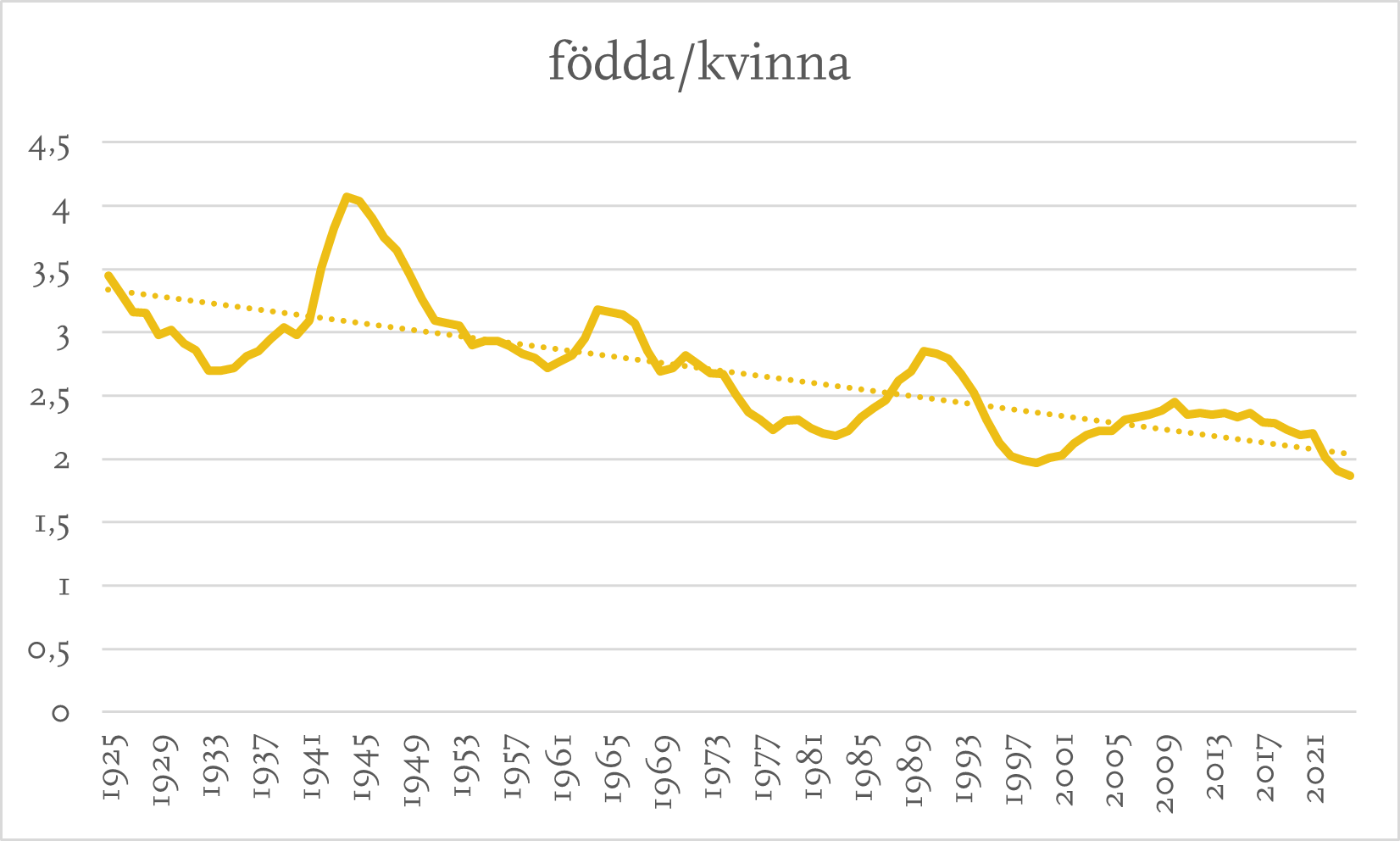 Vi ser att den negativa trenden vad gäller antal födda per kvinna är tydlig för hela peri­oden 1925–2024. Den negativa trenden indikerar att den statistiska genomsnittskvinnans efterfrågan på barn har fallit stadigt över tid. Den minskade efterfrågan på barn har varit möjlig att realisera genom att kvinnor under den aktuella 100-årsperioden successivt har fått ökad kontroll över sin reproduktion genom ökad tillgång till preventivmedel och fri­are abortregler. En annan möjlig förklaring är att en större andel kvinnor idag lever i en­samhushåll och vilket minskar förutsättningarna för att skaffa barn.