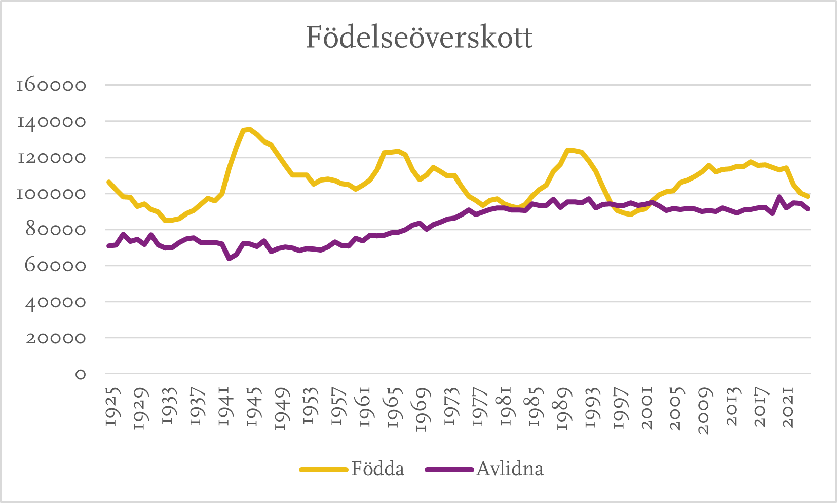 Under 1940-, 50- och 60-talen var den naturliga befolkningsökningen i Sverige hög. I början av 1980-talet var den naturliga befolkningsutvecklingen i stället extremt låg och i slutet av 1990-talet och början av 2000-talet var den till och med negativ. Om födelseta­len på 2020-talet fortsätter att falla, vil­ket är högst sannolikt, kommer vi snart åter igen in i en fas med en negativ naturlig be­folkningsutveckling. Detta är samtidigt under en pe­riod när politiken kraftigt dragit ner immigrationen.